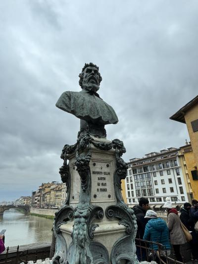 橋の真ん中くらいにチェリーニの胸像があります。16世紀に活躍した彫刻家でしたが、もとは金細工師で、このあたりの金細工の職人さんから「金細工の父」と尊敬され胸像がつくられました。