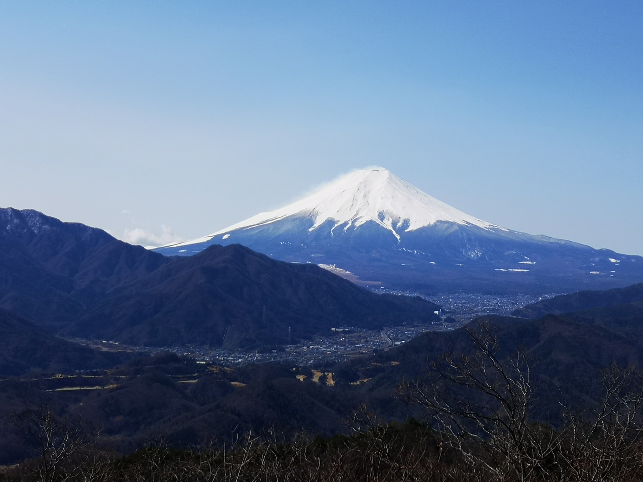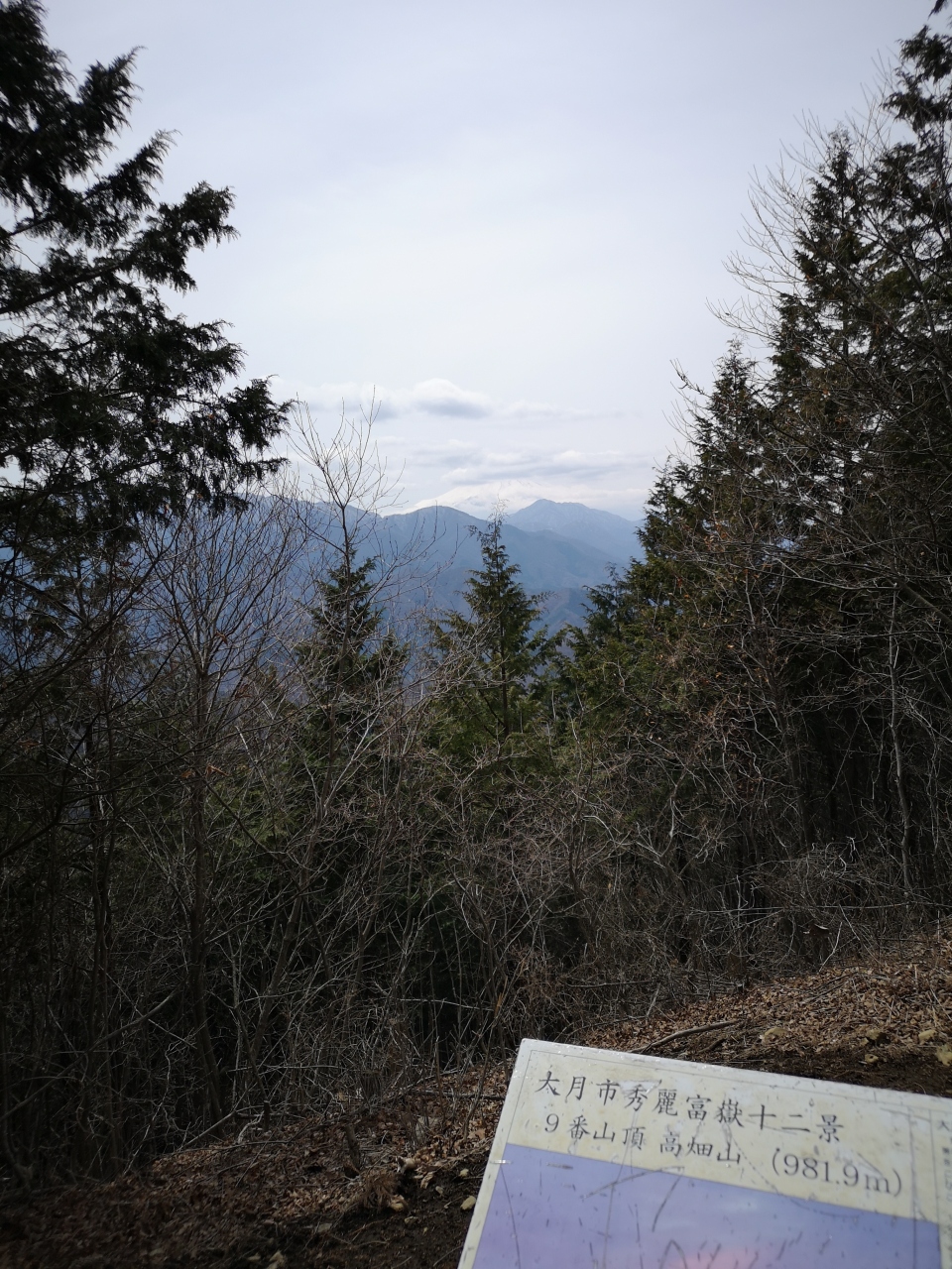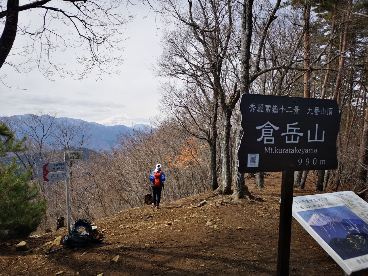 立野峠からは少しザレた急登があり、倉岳山山頂に辿り着く。ベンチは一脚で早い者勝ち。前日の雪のせいか山頂からは真っ白な富士山が!さすがは秀麗富嶽十二景の山だけの事はある。