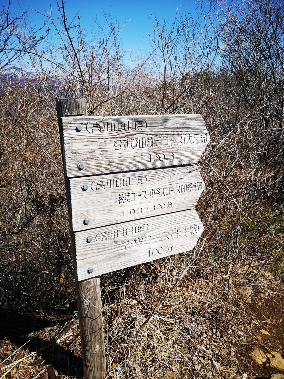 倉岳山から高畑山までは多少の登り返しはあるものの、尾根沿いに進むので楽に歩くことが出来る。高畑山からは比較的緩やかな下り。後半はミニロックガーデンの趣が楽しめる。登山口にある小篠貯水池は景勝地らしいが、この時は工事中で水が抜かれ干上がっていたのが残念。舗装された道路に出てから鳥沢駅までが案外長く感じる。帰りは是非、鳥沢駅前にある「いろはや」さんでかりんとう饅頭をお土産に!- 旅行時期