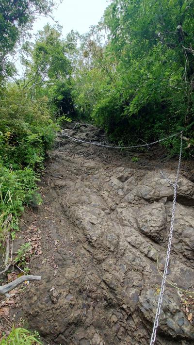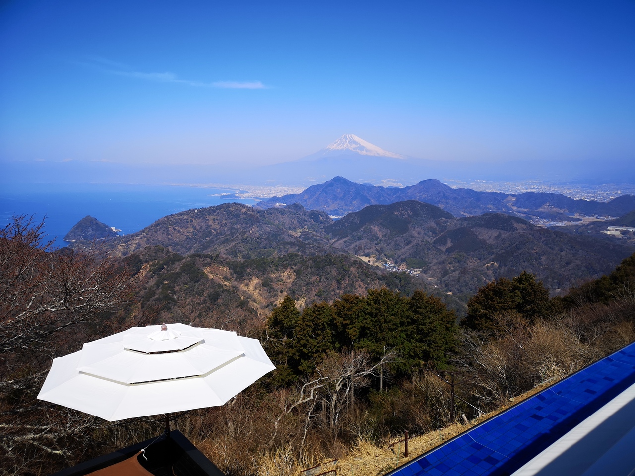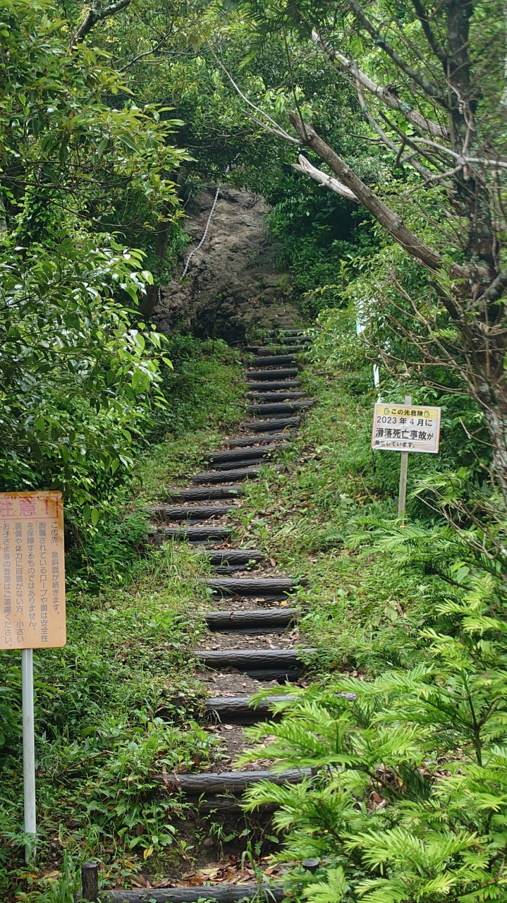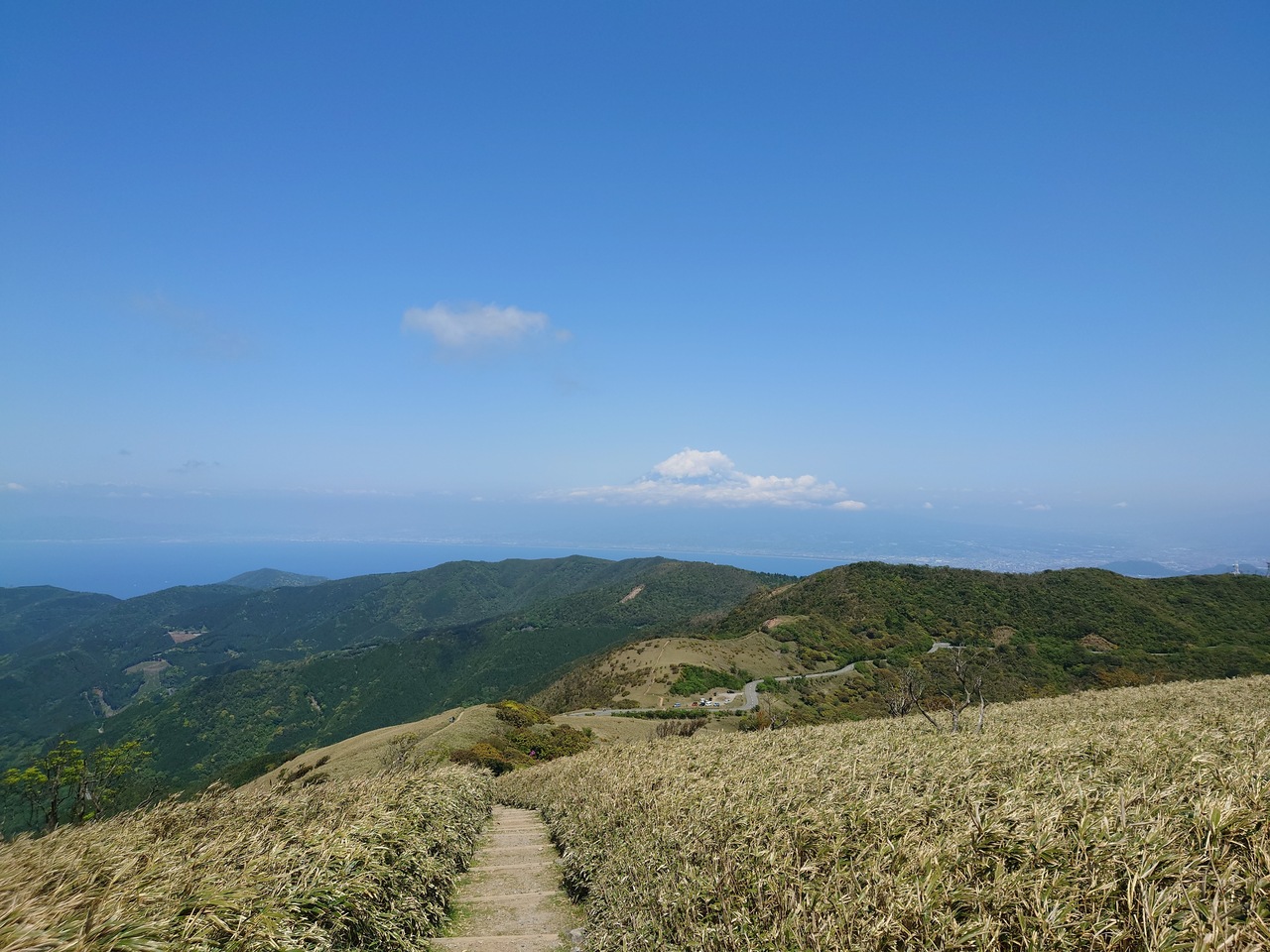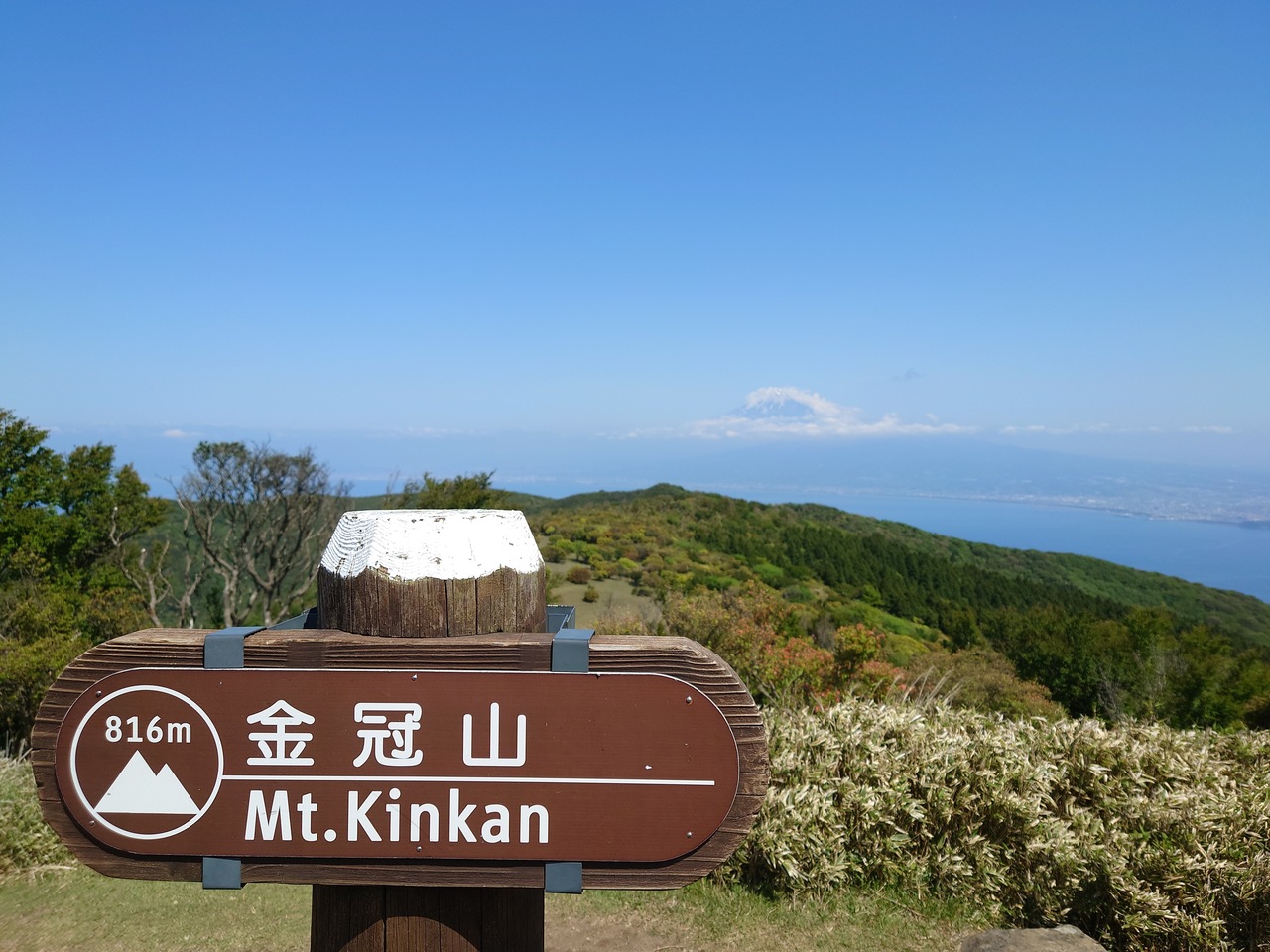 城山~葛城山~発端丈山縦走のメインの山。ロープウェイで気軽に登れ、富士山をバックに映える写真が撮れるのと、プライベートガゼボや絶景足湯などカップルをくすぐる施設満載なので晴天の日曜日、葛城山の山頂は人が多かった。私たちは隣の城山からの縦走で途中廃道(YAMAP上では現役)となった足元がザレた山道をヒヤヒヤしながら登ってきたので、山頂に辿り着いた時には心底ホッとし、山頂にあるカフェ「葛城珈琲」で買ったアイスコーヒーを飲んで生き返った。城山と葛城山の中間に10台ほど停められる駐車場がありココに停めると三山の周遊が楽かもしれない。私たちはその後、ロープが張られて立ち入り禁止の様な登山道経由で発端丈山へ登り、淡島を臨む駿河湾の絶景を堪能する為に三津浜へ抜け、タクシーで城山登山口まで戻った。