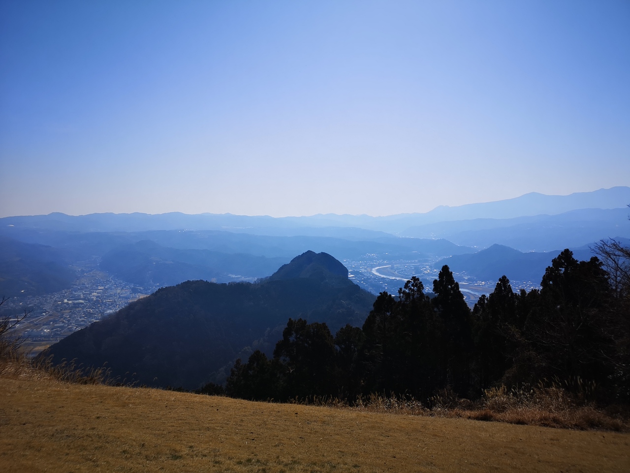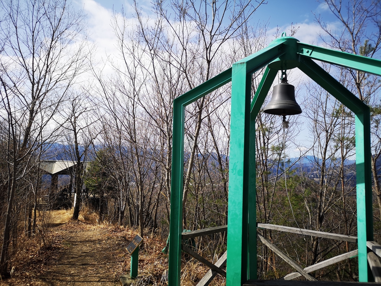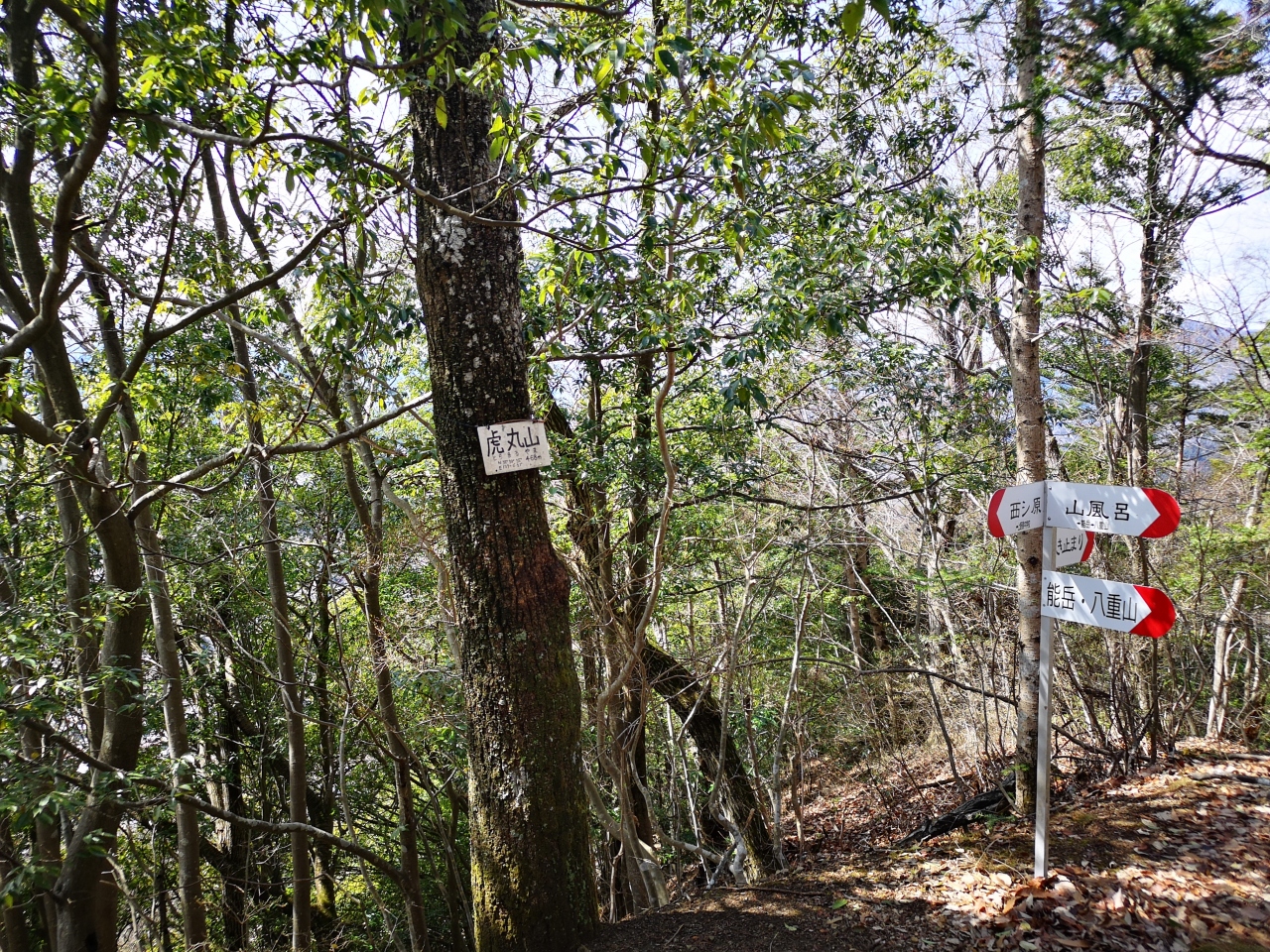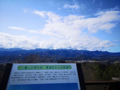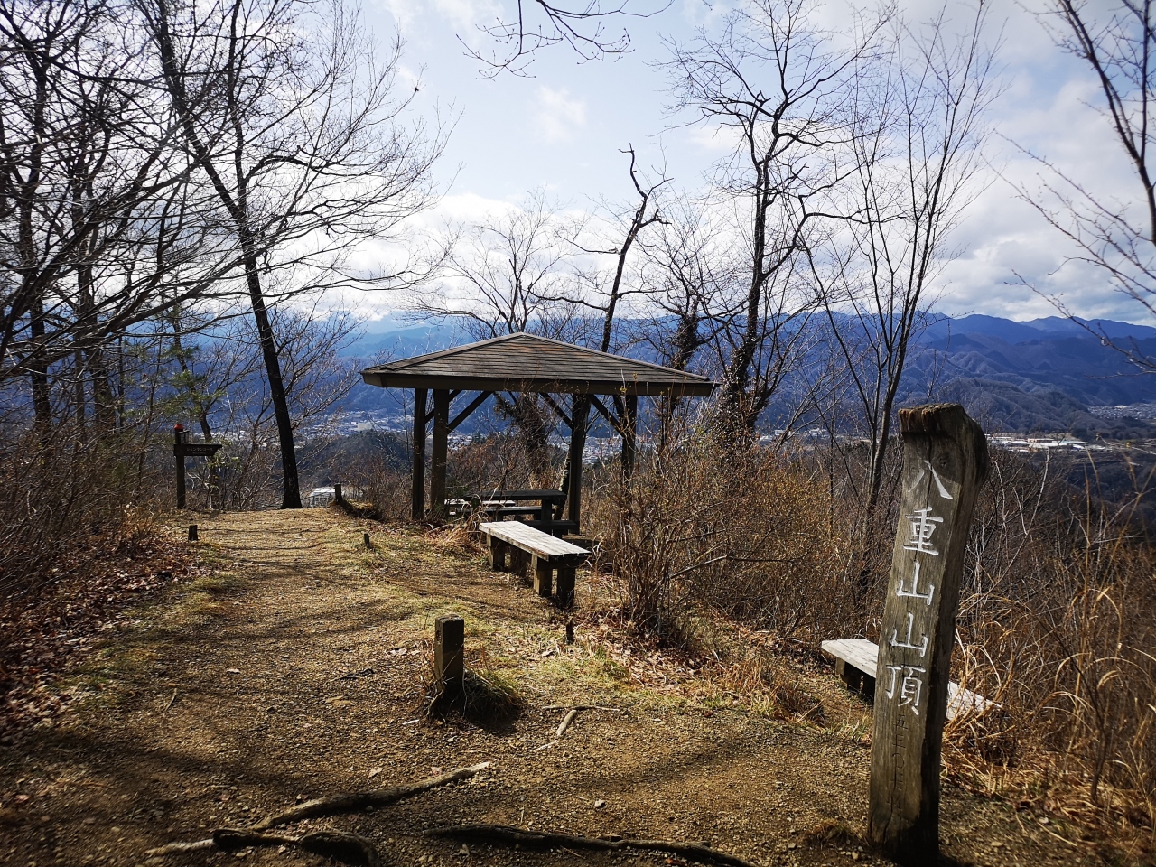 JR上野原駅から歩いて1時間ほどで登山口まで辿り着けるが、今回は登山口にある駐車場からのスタート。駐車場は8台ほど車が停められ、トイレや大きな手洗いを完備してあり便利。コースは非常によく整備されている。地元の上野原中学の生徒が道の整備や周辺に生えている植物の案内などを設置し地域に貢献しているようだ。展望台までは登山口から50分ほど。展望台から標高506mの山頂までは目と鼻の先。途中には恋人たちの聖地にありそうな鐘もある。この日は八重山から少し足を伸ばして能岳~虎丸山を経由して駐車場に戻った。生憎富士山はこの日隠れていたが、道志の山々が見渡せ気軽なハイキングを楽しむことができた。