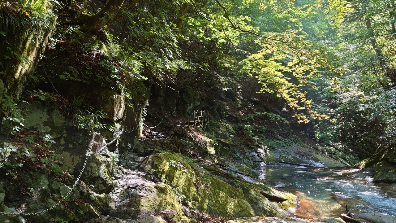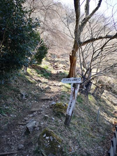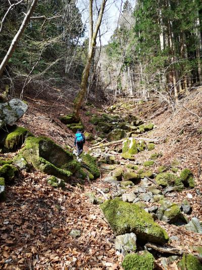 ガイドブック等を見ていると、JR中央線鳥沢駅から高畑山経由で登るのがお薦めのようだが、帰りの事を考えて逆ルートの梁川駅からのルートで登ることにした。梁川駅から登山口まで20分ほど。登山口からは沢沿いを何度も渡渉しながら歩いていくので変化があって退屈しない。道標もマメに設置してあり、道も整備されているので道に迷うはずがないのだが、猪突猛進の息子が先行していたのと、分岐で写真を撮っていた為に、運悪く獣道に迷い込んでしまい40分ほど時間をロスしてしまった。案外ピンクテープが点在しているので、地図はしっかりと確認した方がよい。まぁ、普通は間違えないと思うけど。