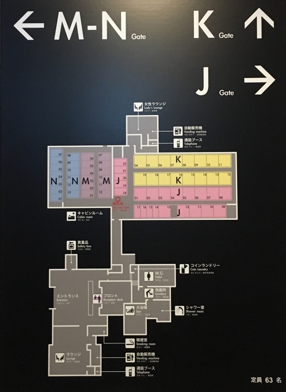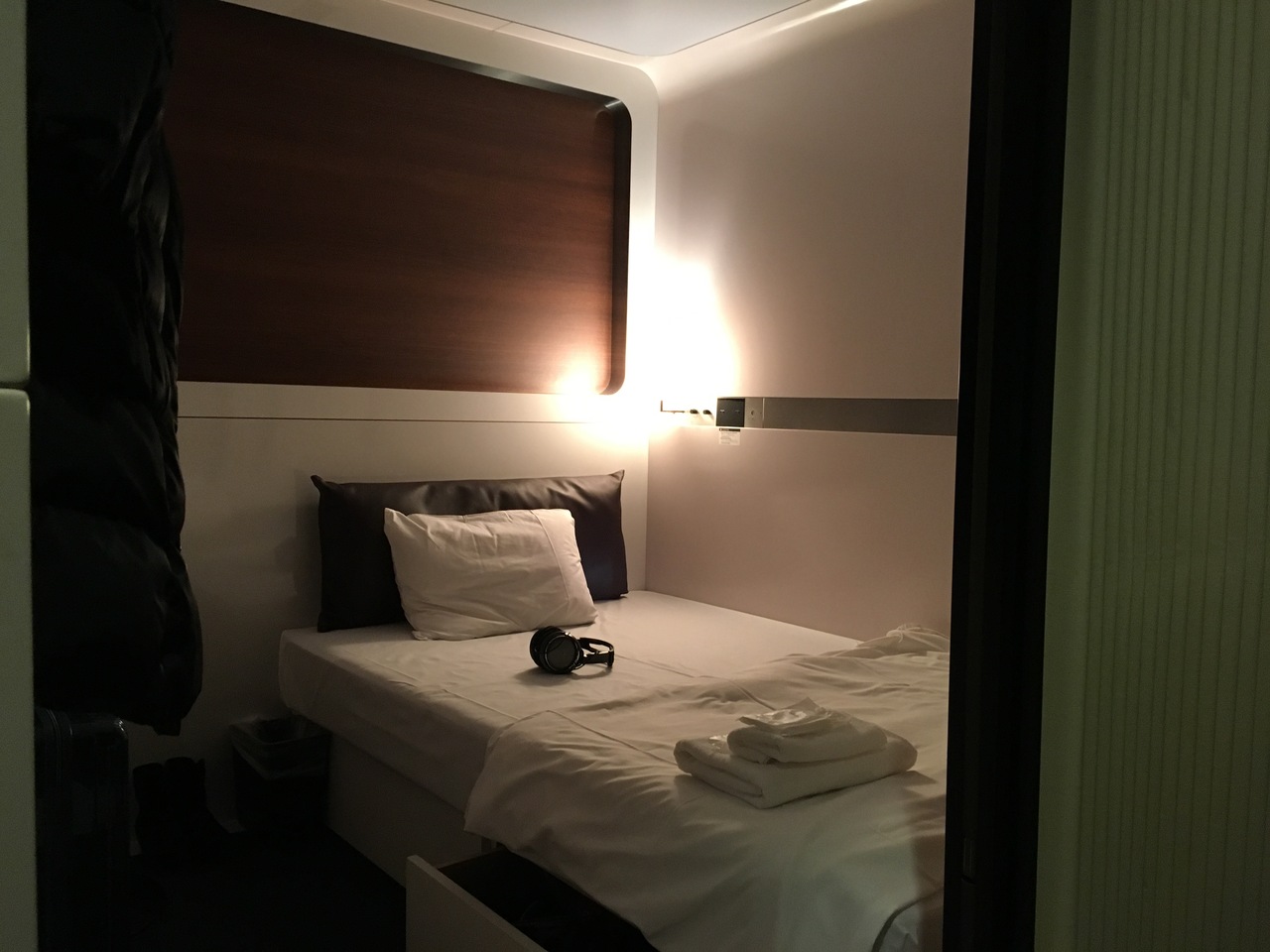 ファーストキャビンに泊まりましたので、ベットの脇で小さいスーツケースを広げることも出来ました。女性エリアに入るのもセキュリティカードが必要で、部屋には鍵がなくアコーディオンカーテンがドア代わりになっていますが、貴重品はベッド下に収納できるので安心です。