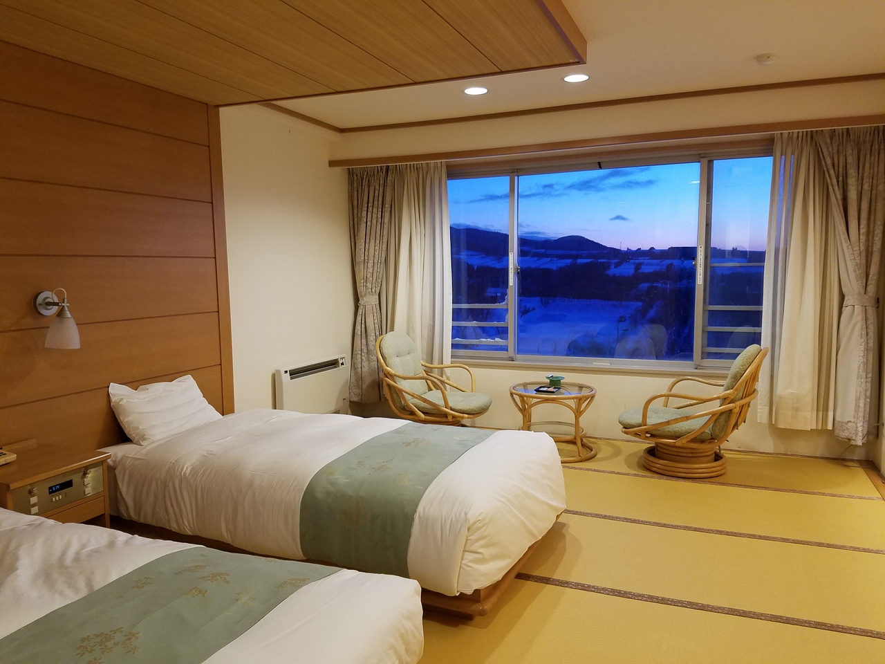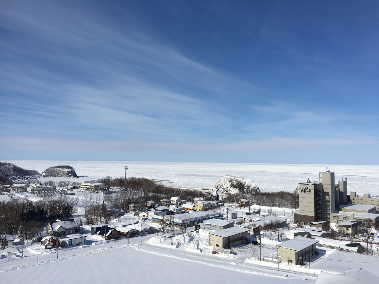 西館の部屋からはウトロの町と流氷と夕日が見えます。