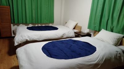 ツインベッド、朝食付きの共有トイレ、共同お風呂の部屋に泊まりました。