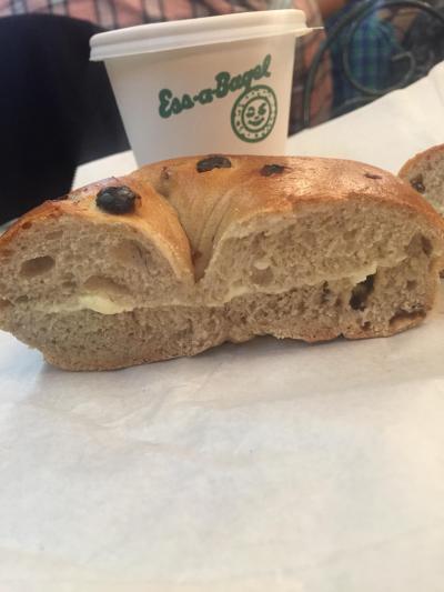 写真ですが、シナモンレーズンベーグルにバターを塗ってもらいました。エッサのベーグルは久しぶりでしたが、おいしかったです。日本からの撤退は残念ですね。- 旅行時期