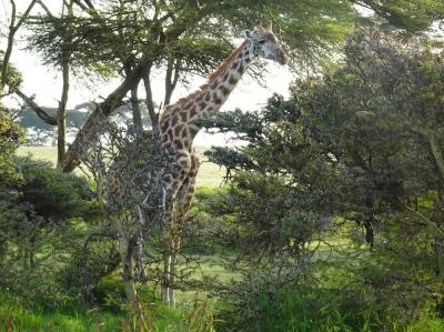 キリンもいます。優雅に高い部分の草を食べています。水辺のキリンというの...