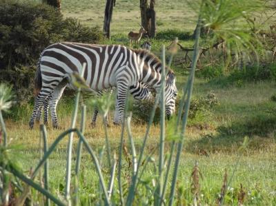 草を食んでるシマウマ。奥にはトムソンガゼルもいます。シマウマとガゼルは...