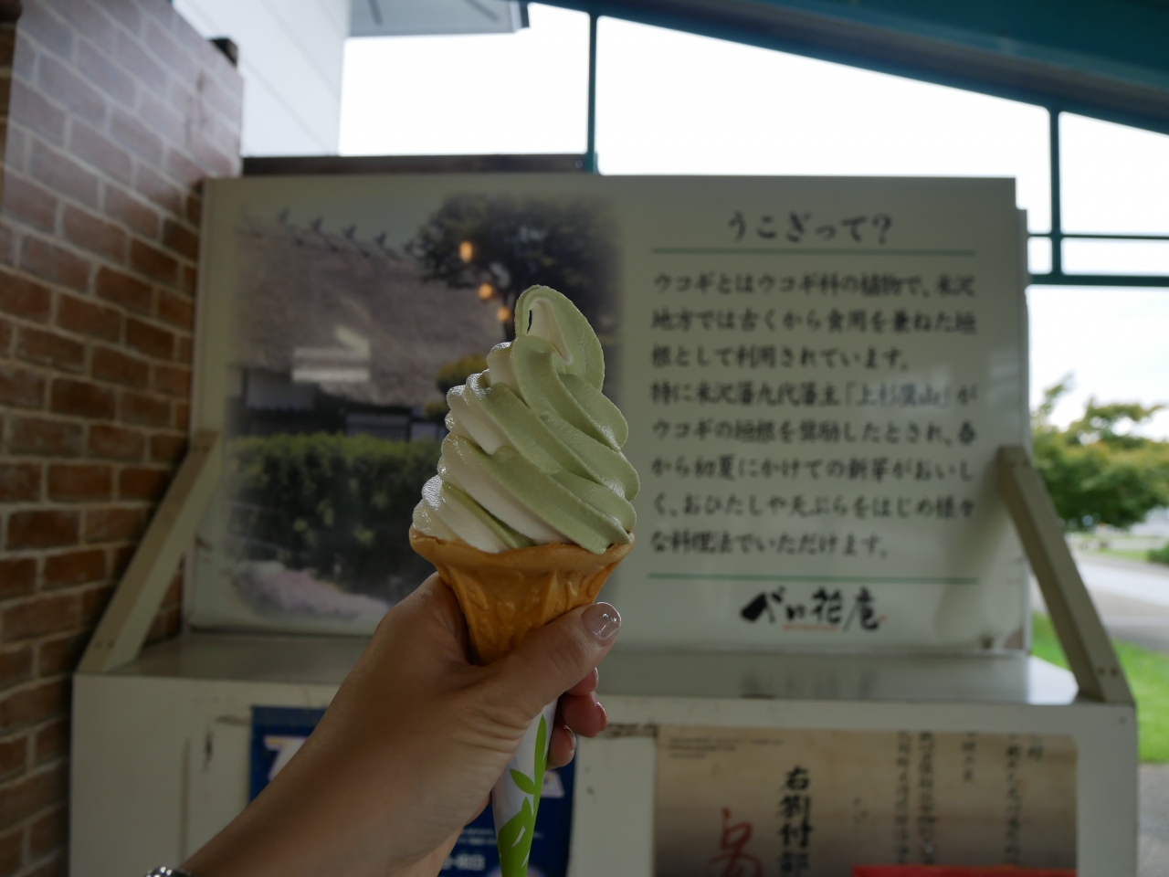 ジェラートもおいしそうだったのですが、この地方の生垣に使われ食用にもなる「うこぎ」のソフトクリームというものに惹かれて食べてみました。