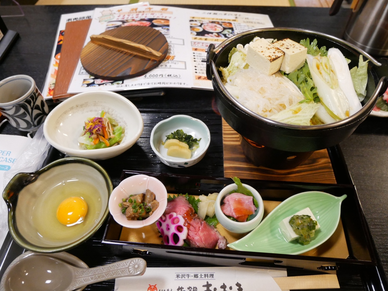 メインは米沢牛三種(リブロース、肩ロース、赤身)の牛鍋、お米はつや姫、味噌汁はなめこ汁。