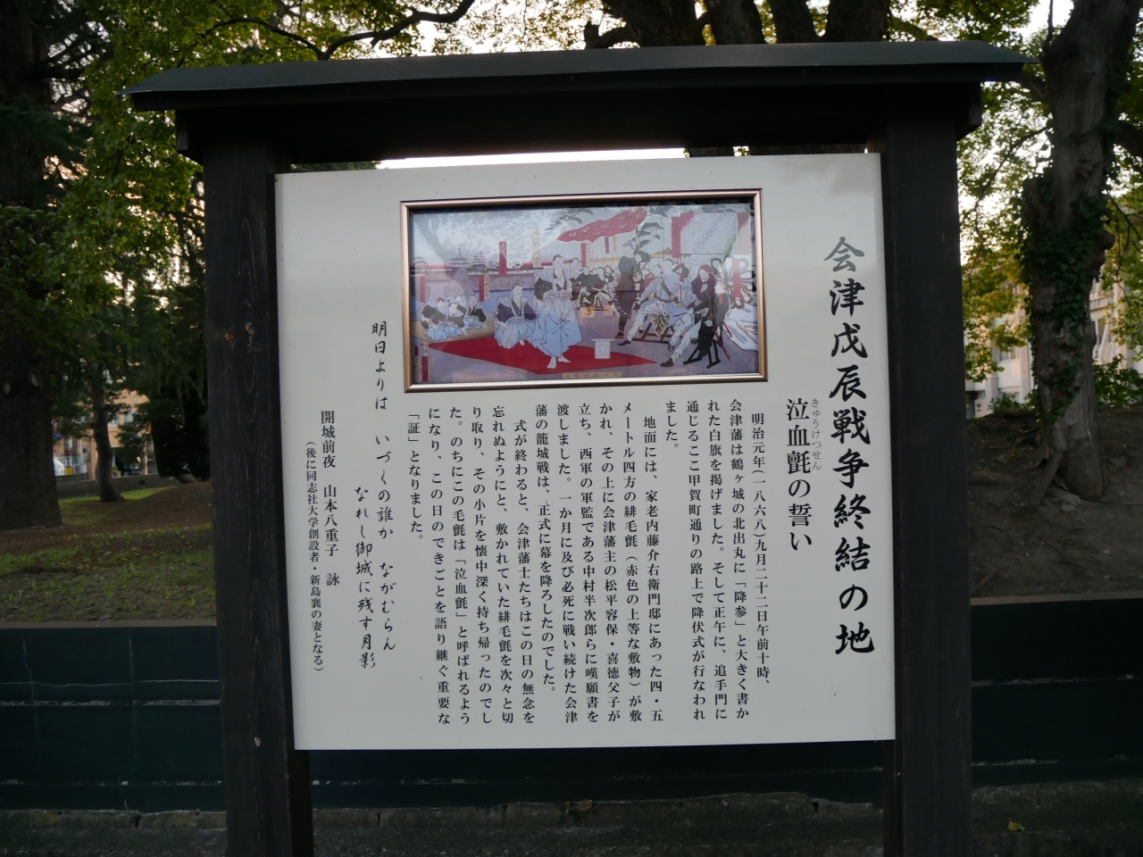 ちょうどこの場所で降伏式が行われ、緋毛氈を敷き会津藩主の松平容保・喜徳親子が嘆願書を渡し正式に降伏したということです。- 旅行時期