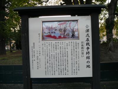 鶴ヶ城の北側の通り北出丸大通りにこの場所が会津戊辰戦争終結の地であることを示す案内板がありました。