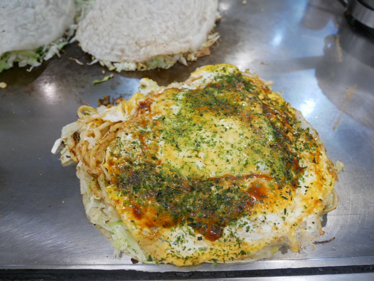 出出来上がるまで目の前の鉄板で次々と焼くお好み焼きを見ていると…まず薄いクレープみたいな生地を焼いてその上にキャベツともやしを乗せて最後に卵で挟んで…と関西の全混ぜて焼くお好み焼きとは全然違う。