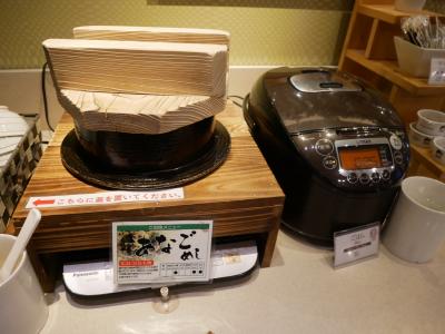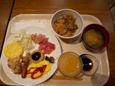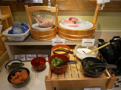 朝食は広島名物のあなご飯と大阪の黒門市場直送のマグロ丼があって他におかずもいろいろ。