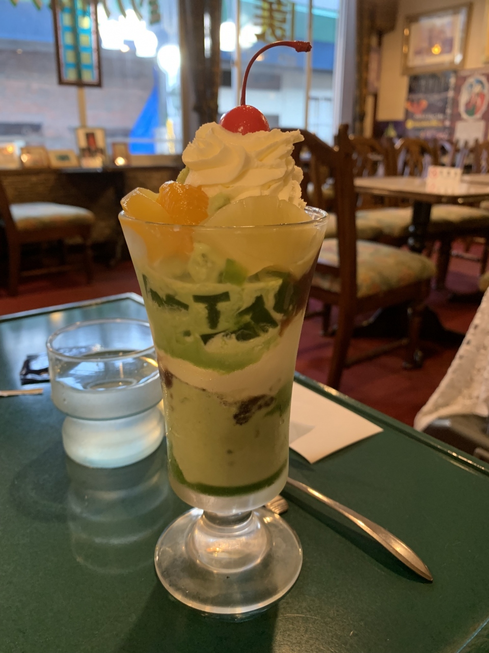 抹茶伯福栄(抹茶パフェ)を注文しましたが割と大きくって抹茶ゼリーも入っていてなかなかのボリューム。