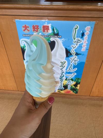 名前の通り積丹ブルーの色をしたソフトクリームでミント味とのことですが、ミントの味はほとんどしなくて言われてみればミントの味がするような…という程度なのでミントが苦手な人でも大丈夫だと思います。