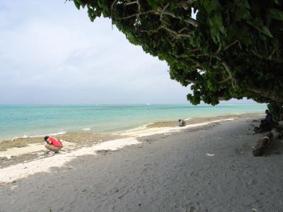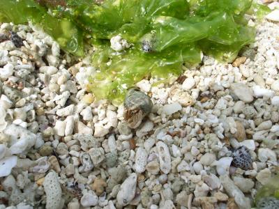 やどかり。どこのビーチにもいます。近づくと貝の中に閉じこもってしまうの...