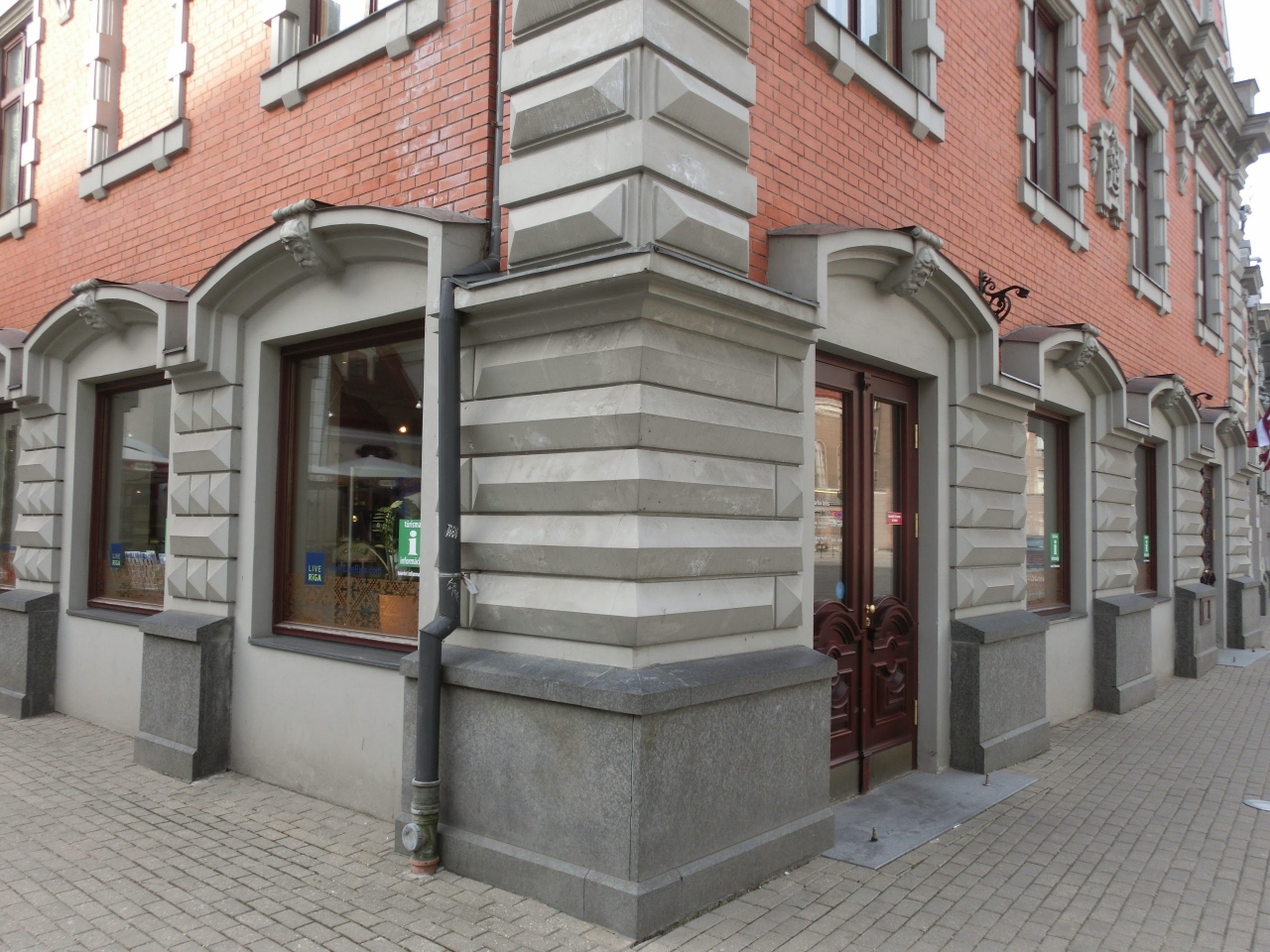えっ、ここが観光案内所?という場所にあります。リガの有名建築、ブラックヘッドの会館の端っこが案内所として使われており緑白抜き文字の「i」が見えると思います。