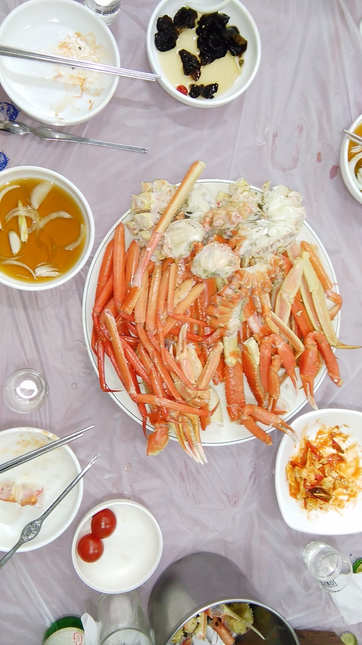 一度行けば病み付きになるうまさ。友人ともどもまた行こうとなり2年ぶりに訪れた。こちらは4、5度目。友が2度目。加えて初陣も誘って、おっさん3人でタラバガニを食らった。2尾計4キロにおまけのズワイの脚10本ほど。〆て16万ウオンで手打ち。ビール、焼酎、名物のカニチャーハンも食って、会計は21万ウオン。1人7千円ほど。2年前は2月上旬に行って1人1万円ほどだった。シーズン末期で安かったのかな。店はカニ市場入り口の左角店のチョンへワンデゲ。いくつか行ったが、ここが一番落ち着くようだ。