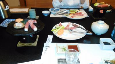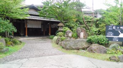 純和風の温泉旅館。与謝野鉄幹、晶子夫妻が1932(昭和7)年に泊まったという老舗らしく、落ち着いたたたずまいで室内は今風に改装されていた。掛け流しの温泉はすばらしい。赤牛ステーキの夕食、地元の牛乳もうまかった朝食とも申し分なかった。雨に濡れないよう車まできて傘をさしてくれたような、接客も心地よかった。