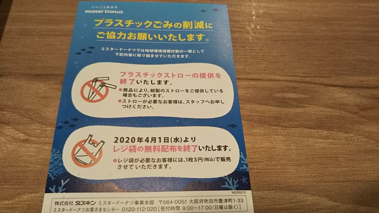 テイクアウトのみ。時短営業中だったミスドが、店内利用も再開しました。持ちかえりのビニール袋は有料(3円)になったそうです。まあ今まで福袋にエコバッグがありましたからエコバッグを持ち歩くことで問題ないですね。エコのためストローも廃止。