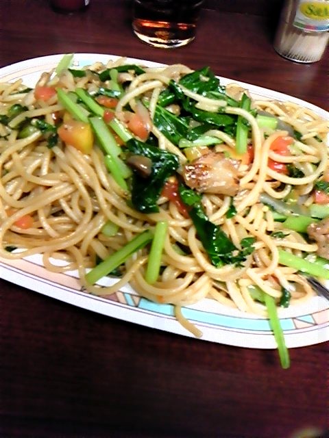 作り置きの焼きそばの太い麺に近いようなパスタをマーガリンだかを引いた火力の強いフライパンでしっかり炒めた後、具をドカっと入れ何度か振ると出来上がり。