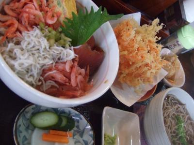 事前にチェックしておいた「てんこ盛り丼セット」(生/釜揚げ桜えび・釜揚げシラス・マグロ刺身と玉子焼きの丼に、そばと小鉢)880円と、桜えびかき揚290円を注文。
