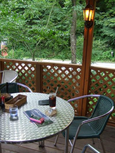 緑に囲まれたオープンエアのデッキ席からは流れの早い小川が眺められ、水のせせらぎを聞きながらたっぷりとマイナスイオンと美味しい空気を味わえる贅沢な空間。