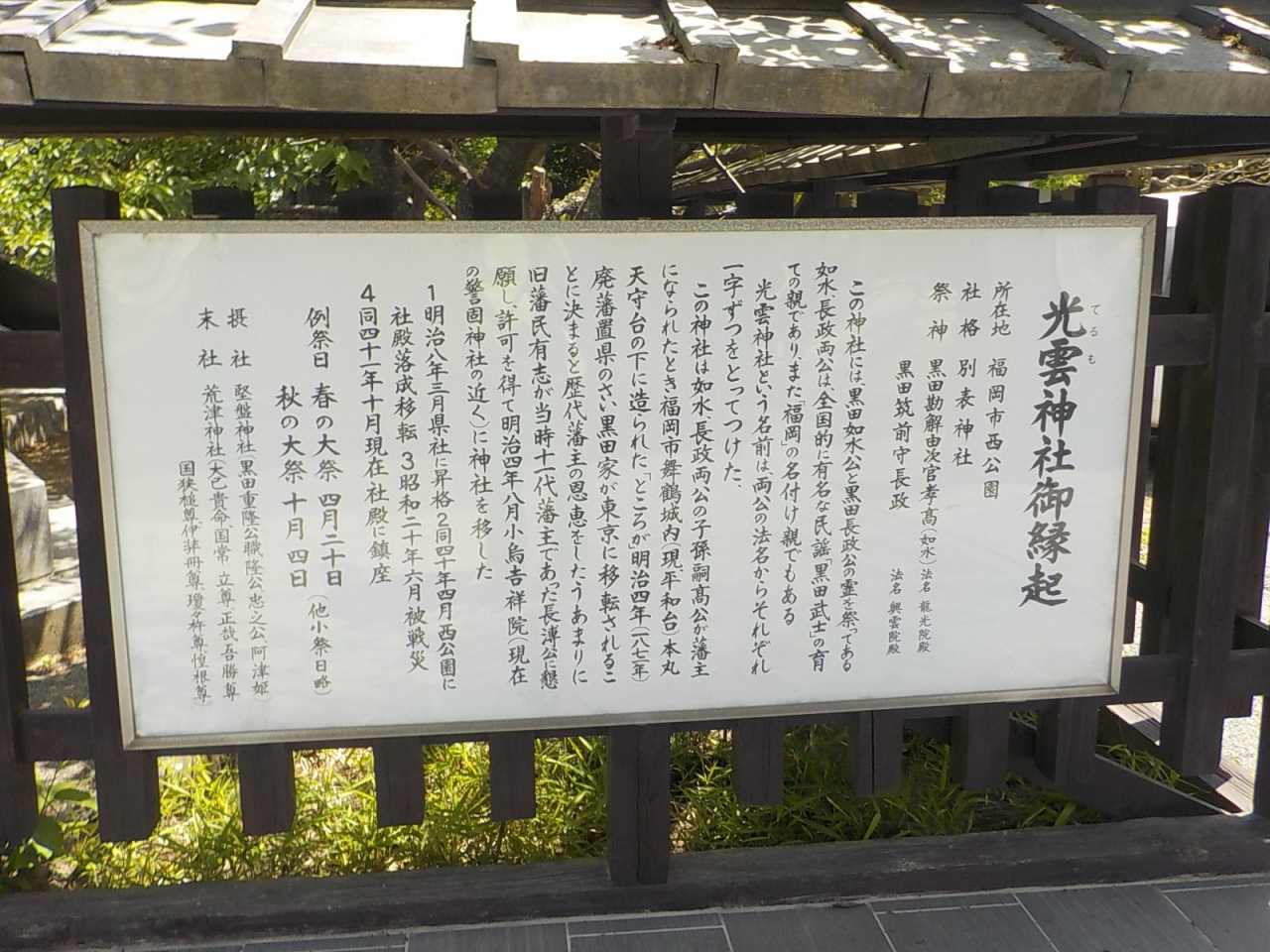 豊臣秀吉に仕えたことのある戦国時代で竹中半兵衛と並ぶ名軍師であった黒田官兵衛とその子で関ヶ原合戦などで武勇の誉れが高い黒田長政をお祀りする神社です。福岡市民の憩いの場である大濠公園からまっすぐ北方向に延びる参道を最後は急な坂ですが、登り詰めると光雲神社があります。拝殿の天井には吉兆を現す丹頂鶴が描かれ、お賽銭を入れると「鶴の鳴き声」が響き渡ります。また境内には、黒田節のモデルになった黒田二十四騎の一人である母里太兵衛が槍を携えた像があり、下部には民謡「黒田節」の歌詞が刻まれています。黒田長政が愛用した水牛の兜の像もあります。