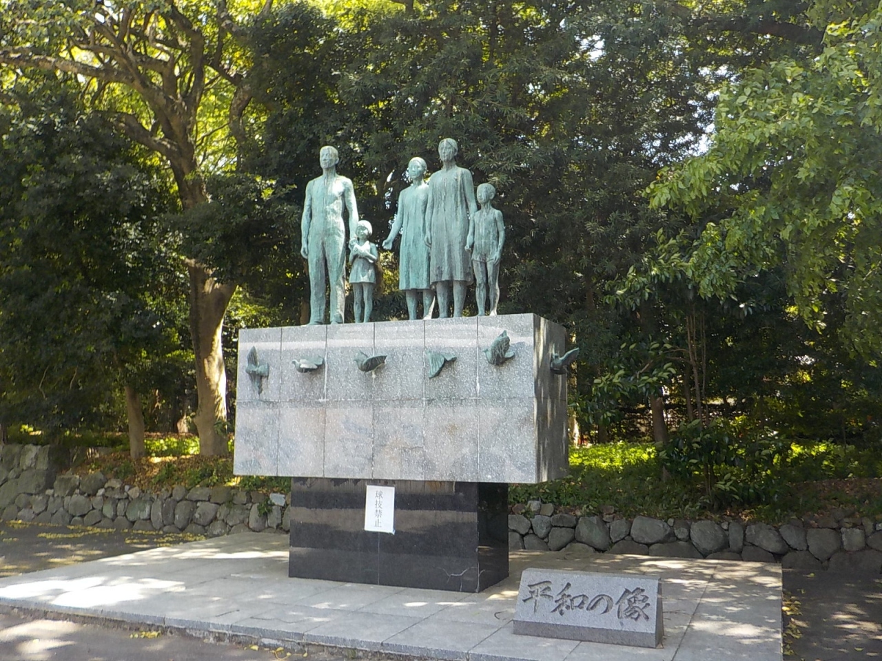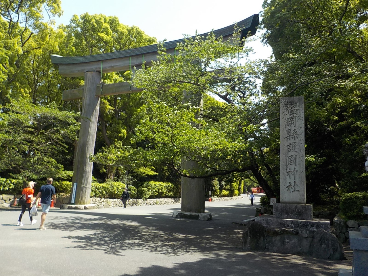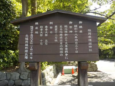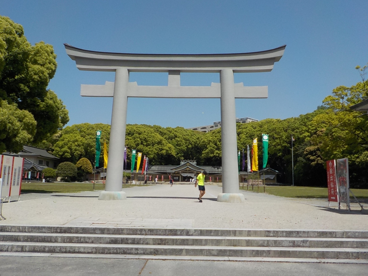 檜の原木をそのまま使った大鳥居が見たくて福岡県護国神社に参拝しました。この鳥居は日本屈指の大きさの鳥居で、柱は高さ13m、直径1.6mの大きさです。見上げるばかりで圧倒されます。しばらく参道を進むと、手水舎とそれに向かい合うように平和の像があります。ここから左に曲がるようにして拝殿に向かいます。明治天皇のご意向により明治維新で殉じた人々を慰霊顕彰するために招魂社が創建されました。福岡県内にあった五社の招魂社を合祀し昭和18年に福岡県護国神社となります。戦災により社殿は焼失しますが、戦後昭和38年に福岡県民の願いにより再建されたものです。