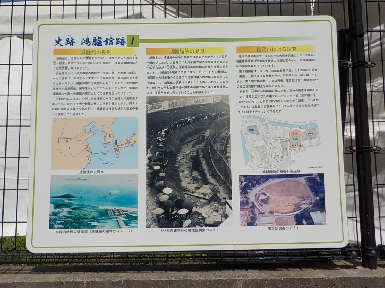 平安時代に全国で三か所に置かれた外交施設の一つです。現在の福岡市にあった鴻臚館は、飛鳥、奈良時代にに新羅国使をもてなしたという記録が日本書紀にあります。鴻臚館は9世紀前半ころまでは、唐や新羅の使節を接待、宿泊させる迎賓館としての役割を持ち、同時に遣唐使、遣新羅使が旅支度をした建物でもありました。9世紀後半からは唐の商人の訪問が多くなるとともに中国との貿易の中心地になって行きます。中国貿易がやがて博多に中心を移すまでの間、このような役割を果たしていたと言われています。