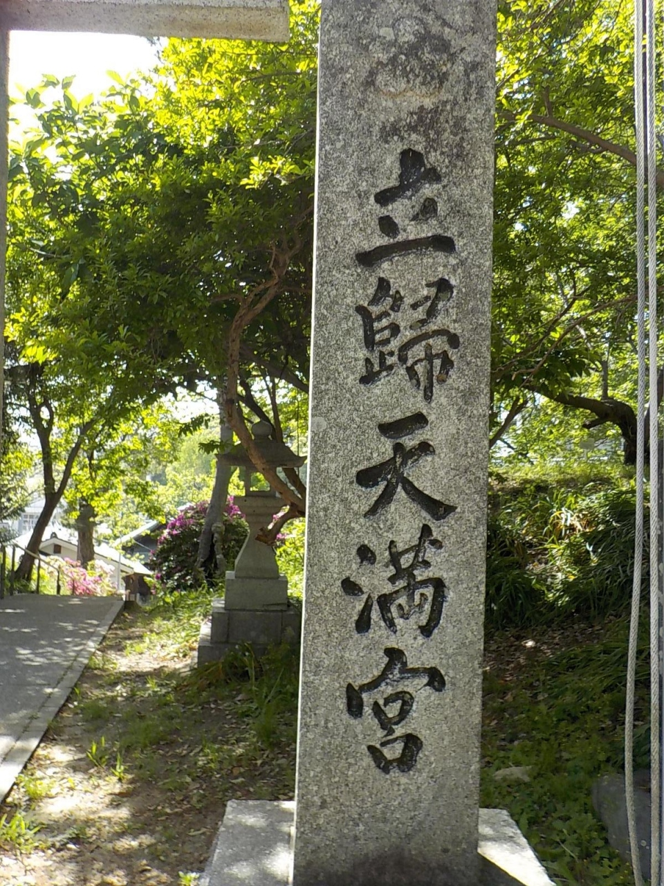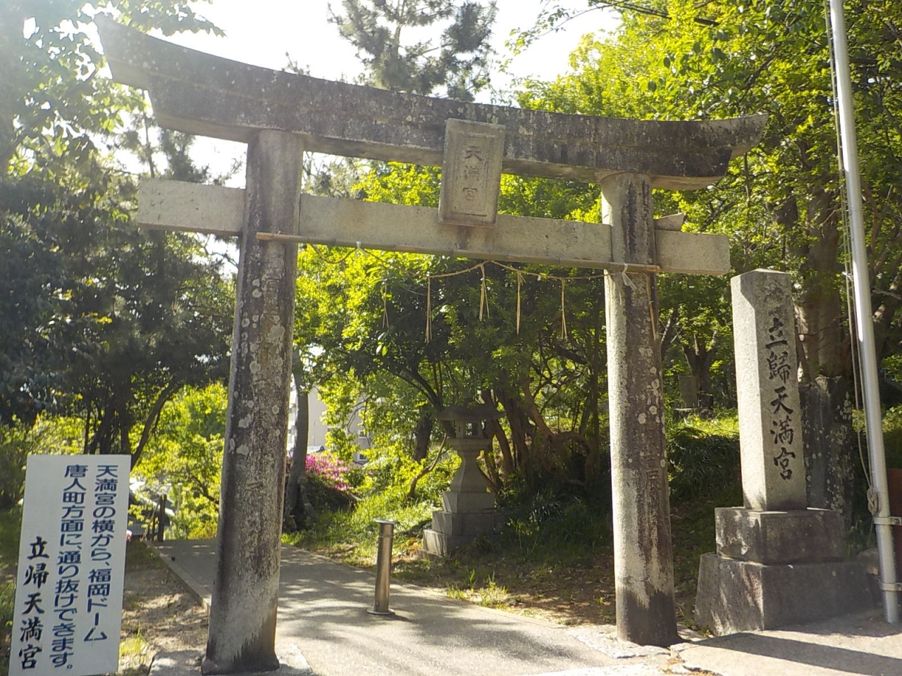 福岡市民の憩いの場にもばっている西公園は荒津山という小高い山ですが、その南の麓にある小さな天満宮です。もちろんご祭神は菅原道真公です。社伝によれば、ご神体は筑紫野市にある九州で最も歴史あるお寺、武蔵寺の境内に祀られていましたが、江戸時代の元禄年間(17世紀)に、荒津山の麓の源光院に移されました。現在の博多湾に近く、航海の安全を祈る福岡藩の藩船の船乗りに厚く信仰されていたようです。その後、明治時代になって、現在の地に社殿が設けられて漁業、航海関係者の信仰をいまでも集めているそうです。