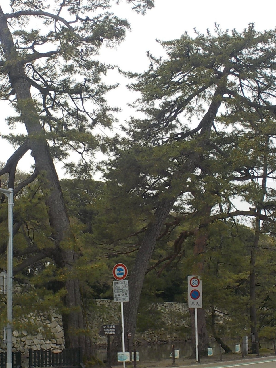 JR彦根駅西口から彦根城に向かってまっすぐ伸びる道路を突き当り、左手に濠沿いの道を歩くと「いろは松」があります。彦根城の中濠沿いにある松並木です。当時は「いろは47文字」になぞえて47本の松が植えられていたそうです。江戸時代にはこの場所は「松の下」と呼ばれていて、藩主が必ず通る所でした。