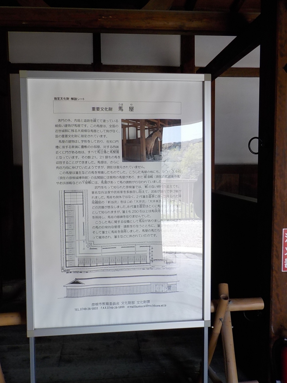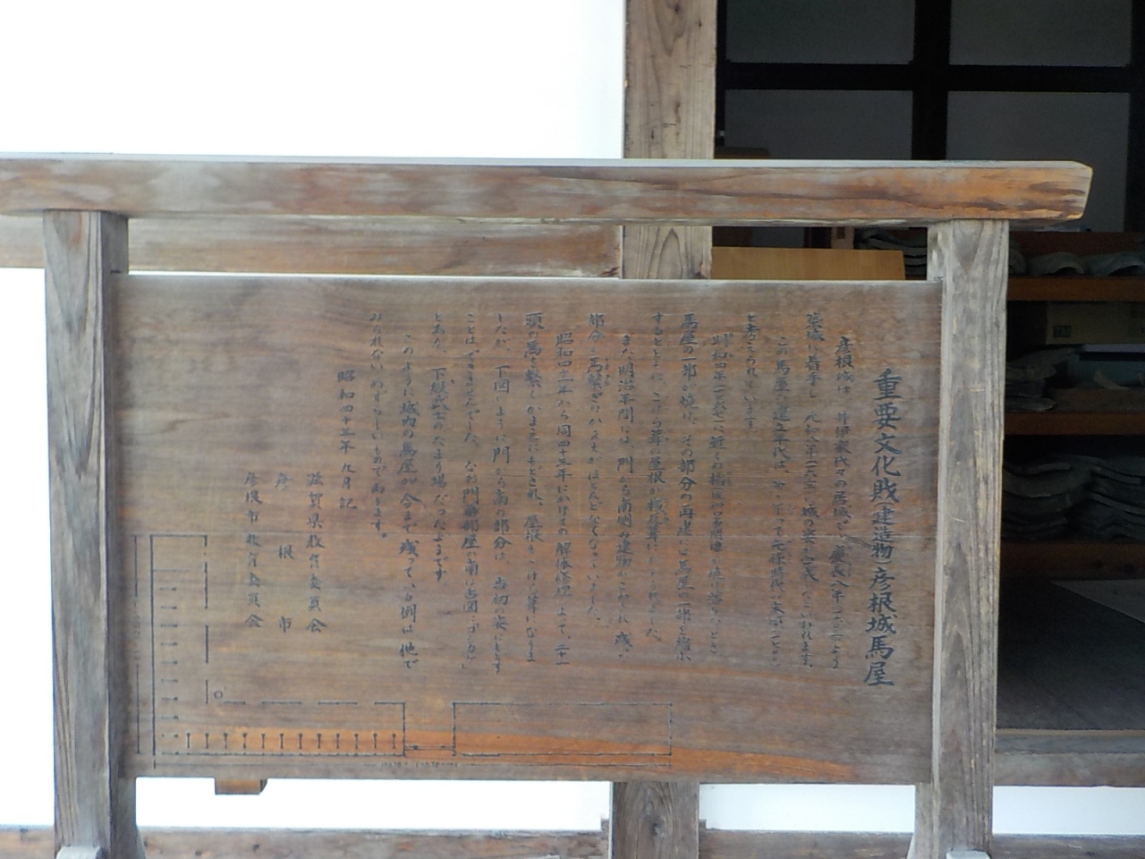 彦根藩藩主の馬などを収めた建物です。L字型になった建物は21頭分の馬が収容できます。日本国内には多くのお城が保存されていますが、これほど大きな規模の馬屋が残っているのはほんどないそうで国指定重要文化財に指定されています。17世紀末に建てられ、一度は消失しますが瓦葺きで再建されたそうです。