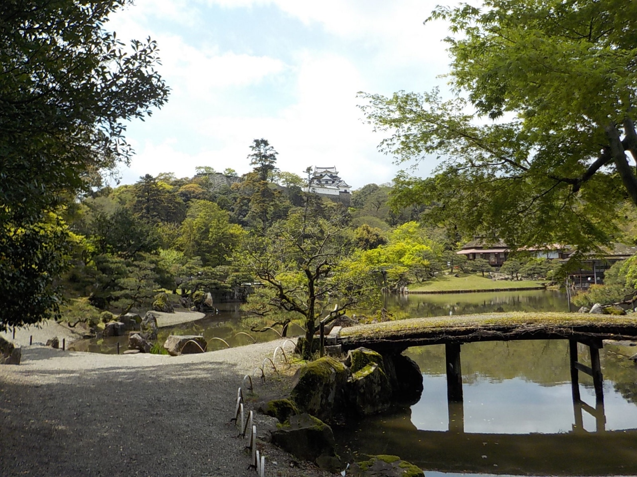 庭園部分を玄宮園、西側の御殿部分を楽々園と呼んでいます。古代中国の宮廷の名にちなみ玄宮園と名付けられた庭園は、彦根藩4代藩主井伊直興により造営が始まり1679年に完成しました。広い池を中心にして、池には島や入江があり、9つの橋が架けられています。変化があるので歩いていても飽きない回遊式庭園です。また散策中には彦根城天守閣が見えます。彦根城だけでなく、ぜひこの名園も散策してほしいと思います。