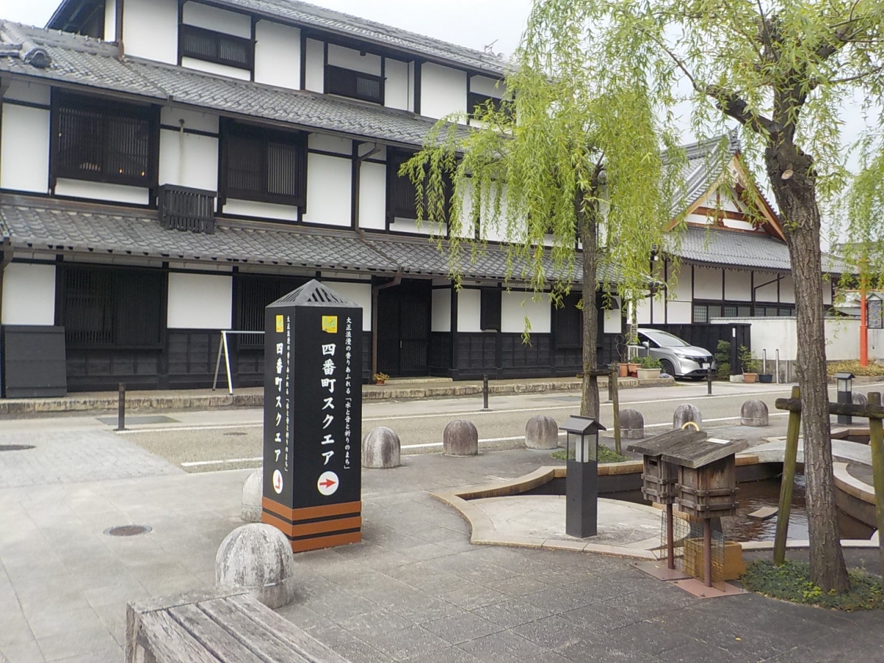 彦根城の京橋を渡り、夢京橋ロードをまっすぐ南に行くと左手にあります。街並みはよく整備されていて柳が植えてあり大正ロマンを感じます。外観はモダンな建物、スクェアにはガス灯を配置しています。モニュメントが所々にあり、水が流れる街でもあります。懐かしさを感じます。お店は食事処、買い物、等ができます。