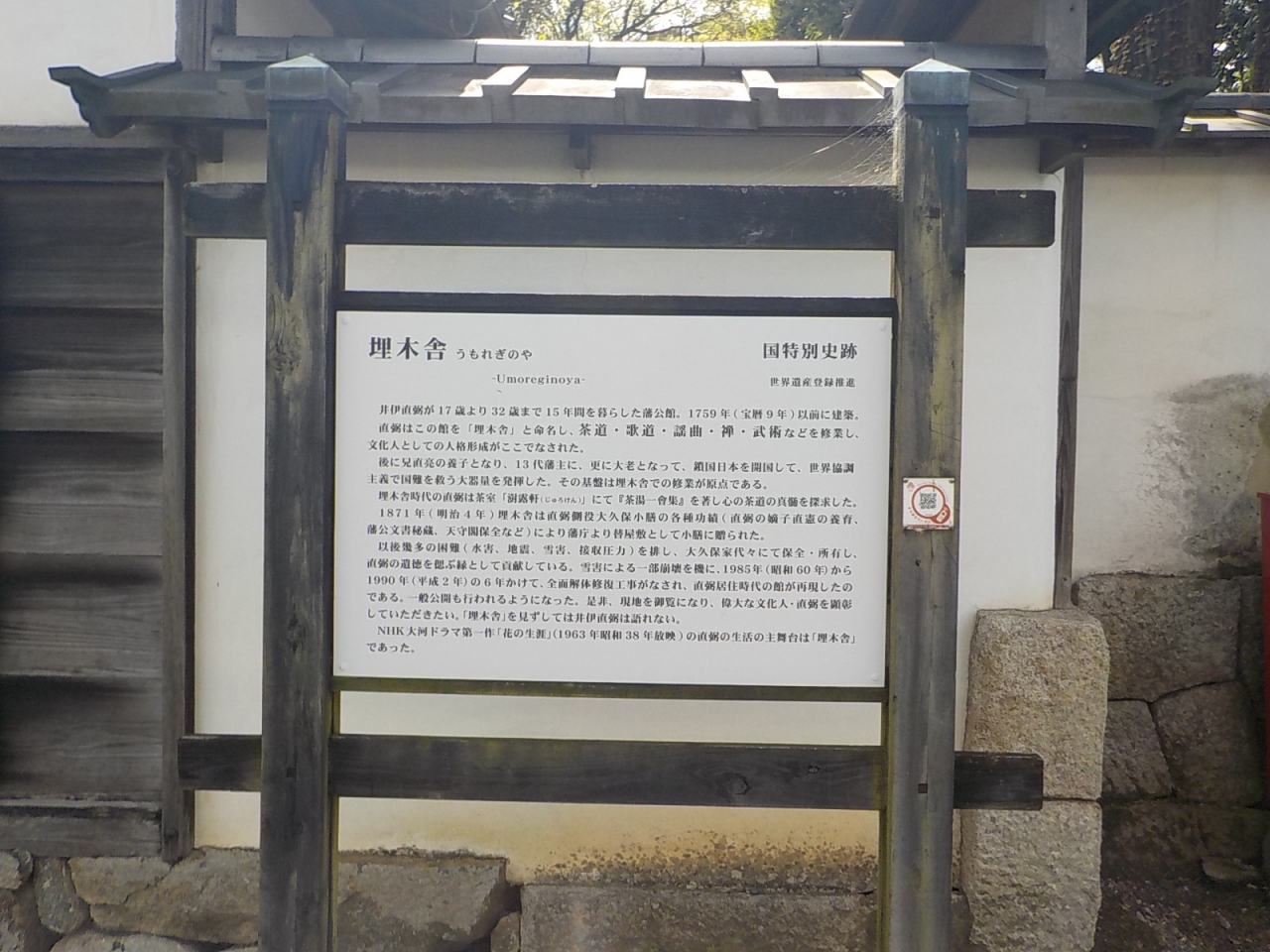 「いろは松」から濠沿いの道を辿るとほどなく中濠沿いに立つ武家屋敷があります。ここが埋木舎(うもれぎのや)です。門の横には碑があり、井伊直弼が17~32歳になるまでわずか300俵の部屋住みの身として過ごしたところです。直弼はここで身心の修練に努め、茶道の精神に学んだといわれています。直弼に「世の中をよそに見つつも、うもれ木の埋もれておらむ、心なき身は」と自分を詠った句がありますが、その句にちなみ埋木舎となったそうです。茶室澍露軒(じゅろけん)が残っています。