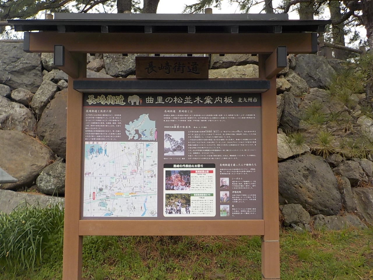 江戸幕府は各地の街道に旅人を暑い日差しから守るために松林を作ることを奨励しましたが、曲里の松並木もその一つです。長崎街道の昔に面影をとどめている松並木が黒崎宿の南側に約1㎞にわたって残されています。現在は公園のようになっていて、休憩所があったりして、市民の散歩する場所としています。