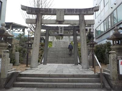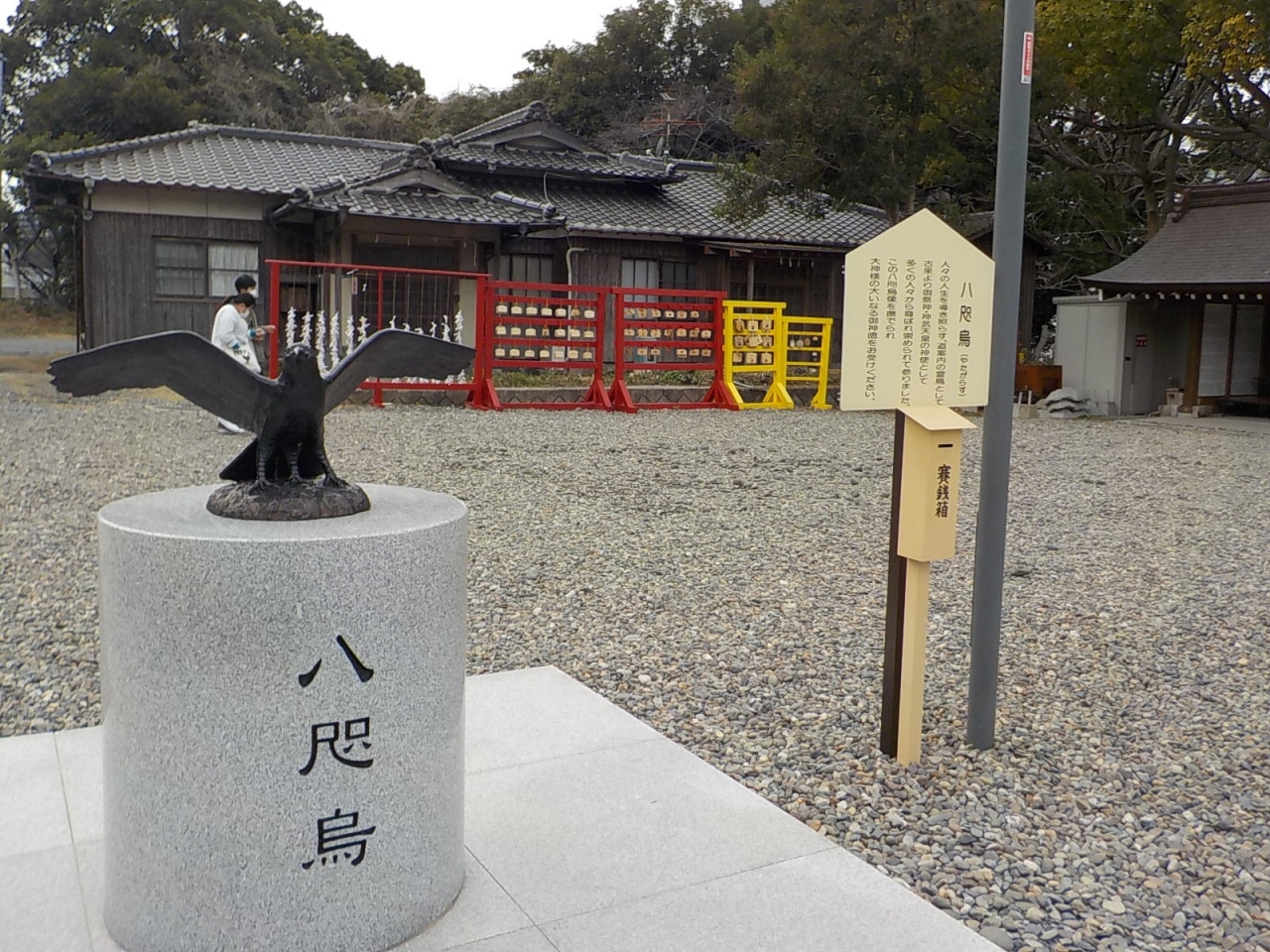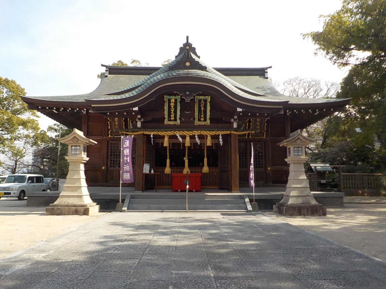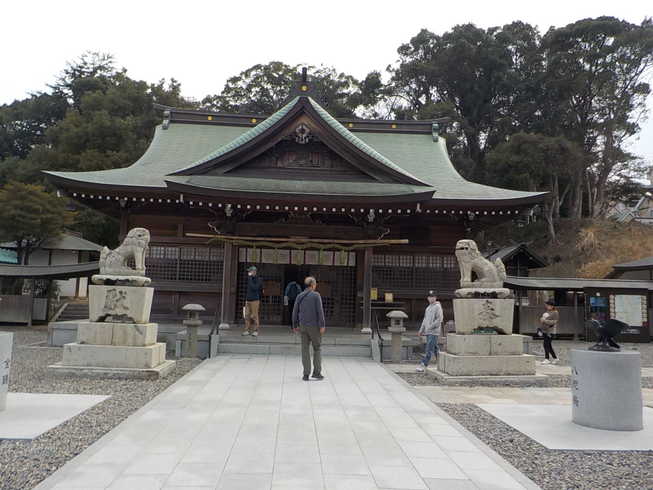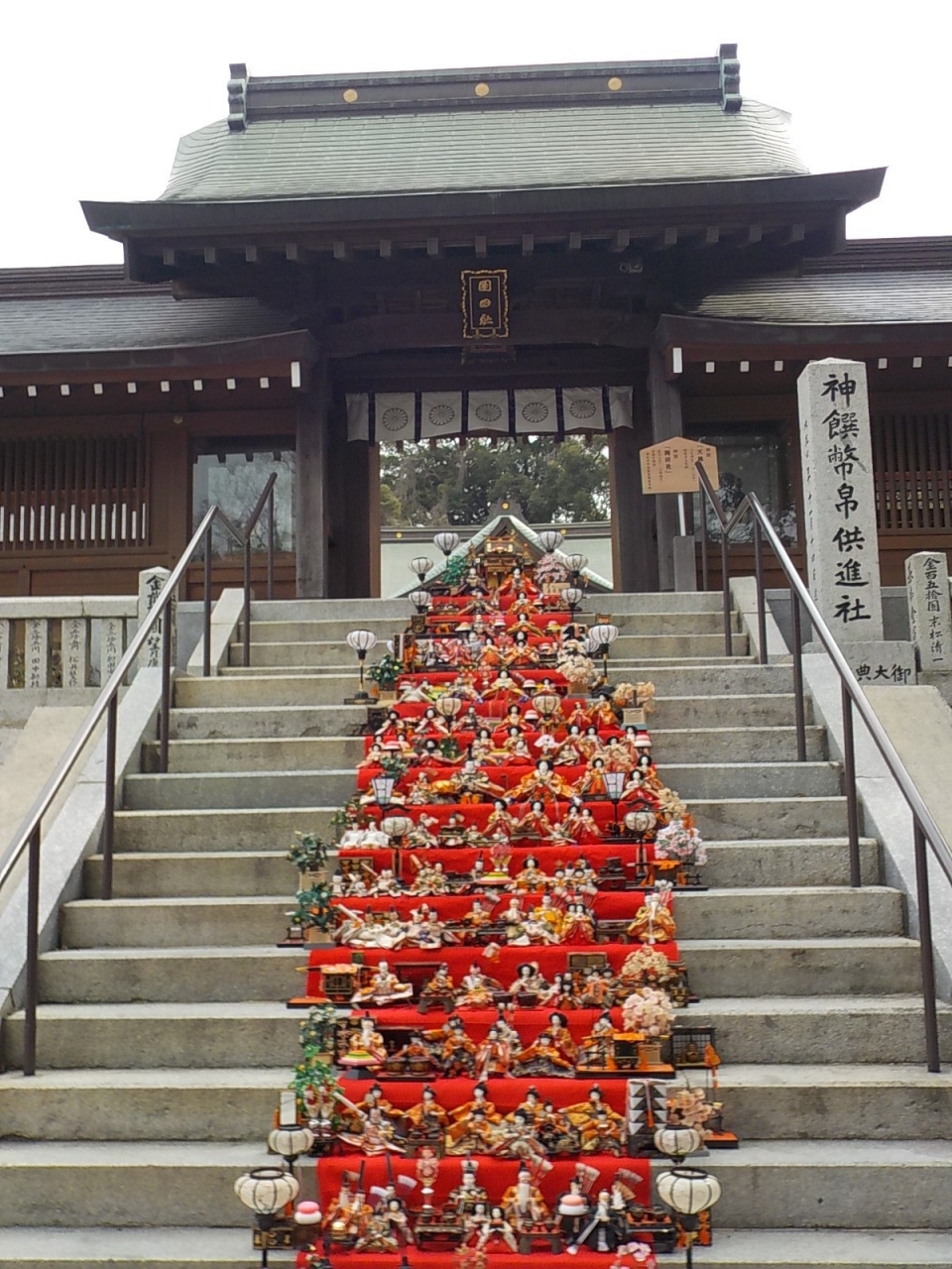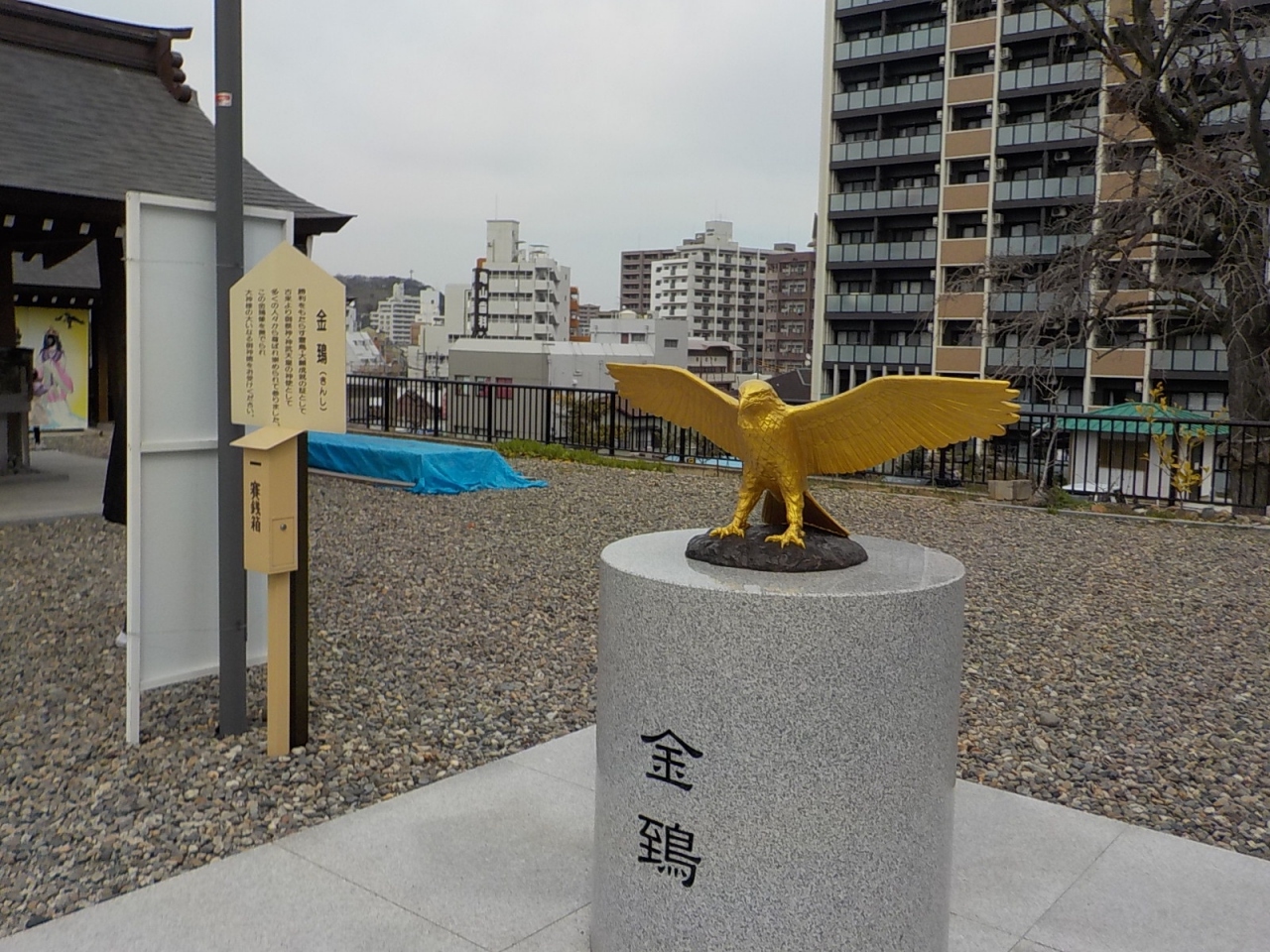 神武天皇が東征の折り逗留されたと伝わる長い歴史を持つ神社です。古事記や日本書記にもこの神社のことが書かれているそうです。黒崎駅に近く繁華街の中にありますが、一歩境内に足を踏み入れると神社らしい荘厳な感じがしてきます。拝殿前の階段には雛飾りが並んでいました。また拝殿前には八咫烏があります。紀伊山地の山中で神武天皇一行が道に迷った時にこの烏が道案内したと伝わっています。