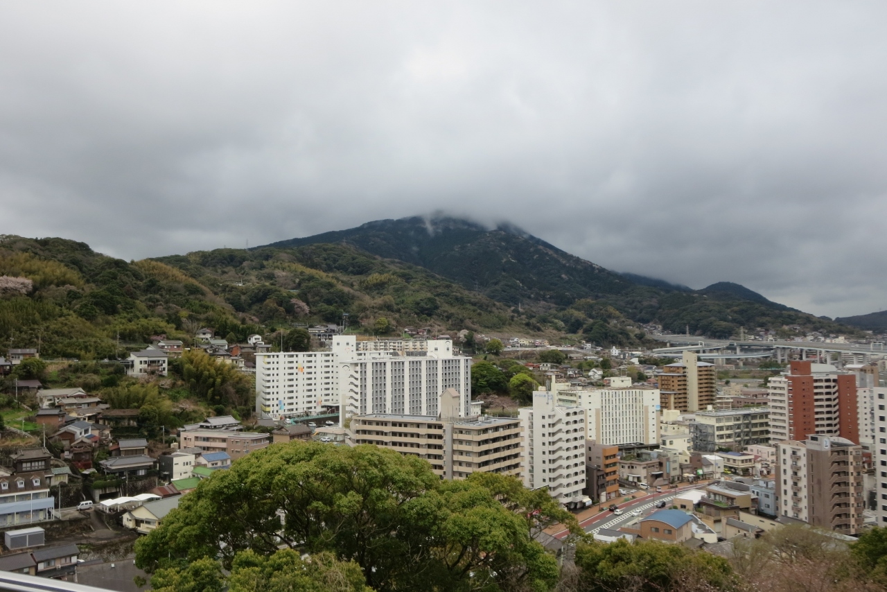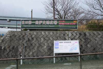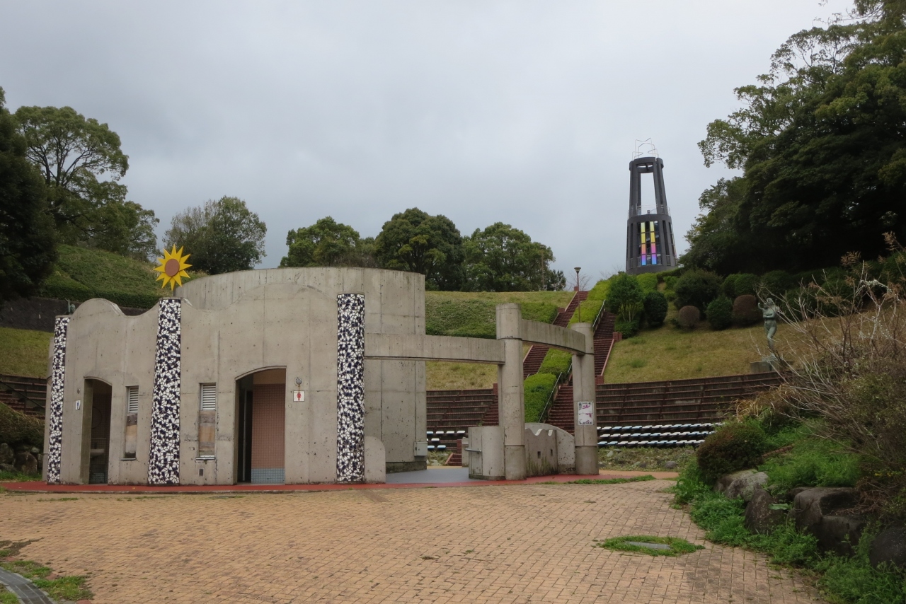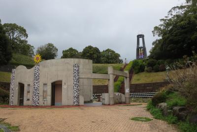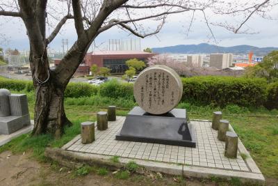 JRスペースワールド駅から歩くのは大変かなと思って、JR八幡駅からバスを利用しました。小高い丘の上にある公園で駐車場は八幡東体育館と共用しています。駐車場から広場までは階段を上ります。広場には「無法松の一生」の一部を抜粋した費などがあります。またさらに丘を登ると八幡製鉄所の高炉をかたどったオブジェがあります。桜も少し咲き始めていますので、この週末(3/26)は花見によいのではないかと思いました。
