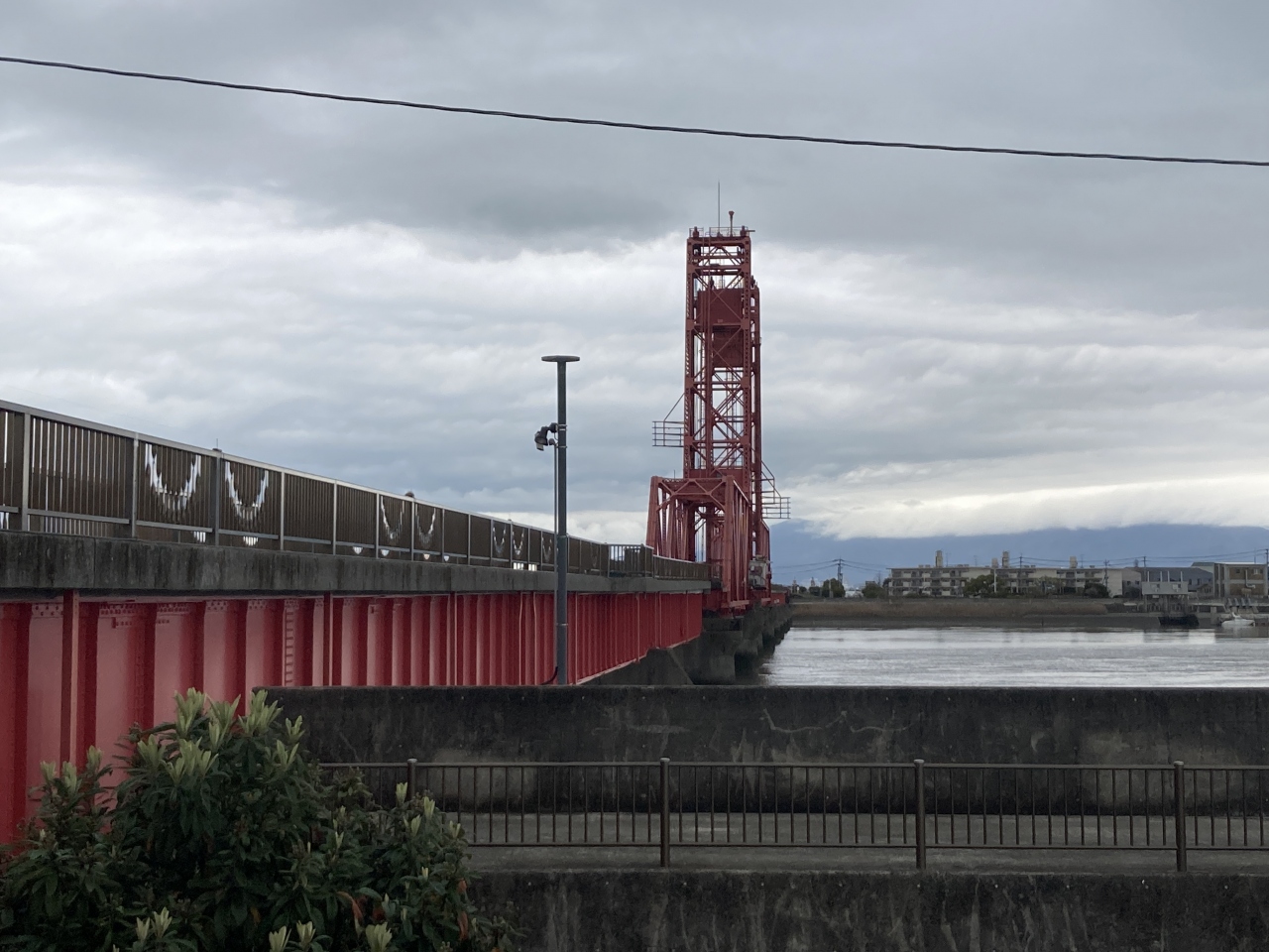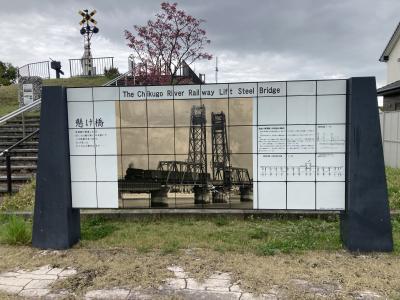 旧国鉄佐賀線で利用されていた東洋一と言われる中央部が中央部が上下に可動する鉄橋です。九州一の大河、筑後川の河口付近、大川市にあります。約500mある橋の中央部に高さ30mの鉄塔があり、その間に渡された橋が上下に稼働します。橋が上がったところで大型船が航行できるようにしてあります。現在は鉄道の軌道はなく遊歩道として一般に開放されています。橋の中央まで行った時に係の方がサービスで可動部分を少し上げていただけました。