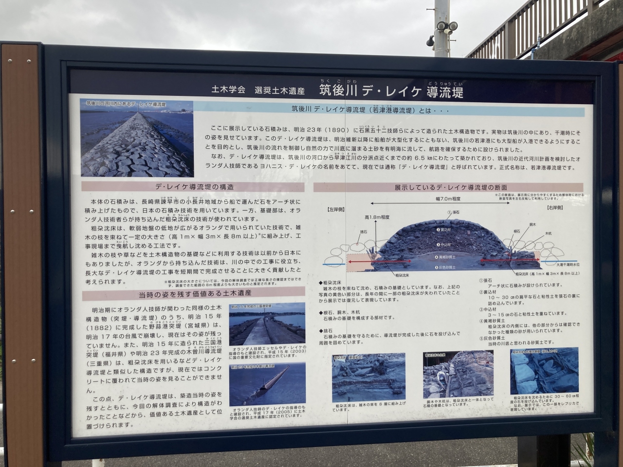 潮の干満差が6mにもなる有明海は潟と呼ばれる泥が海まで流れ込みにくく川底に堆積します。筑後川の船舶輸送は川底が浅くなると支障をきたすので、筑後川左岸側の潟の堆積を防ぎ航路を確保するために明治時代に造られたのがこの導流堤です。干潮時のみこの導流堤は水面上に姿を現わします。導流堤の効果で筑後川の流れが速くなり、堆積する潟は河口に押し流されて航路を維持することが可能になりました。現在でもこの導流堤の恩恵にあずかっています。新田大橋から干潮時によく見えると言われていますが、ちょっと遠いので昇開橋の上から見ようとしましたが潮の関係かよく分かりませんでした。代わりに昇開橋の福岡県側のたもとにある導流堤の模型を見ることにしました。