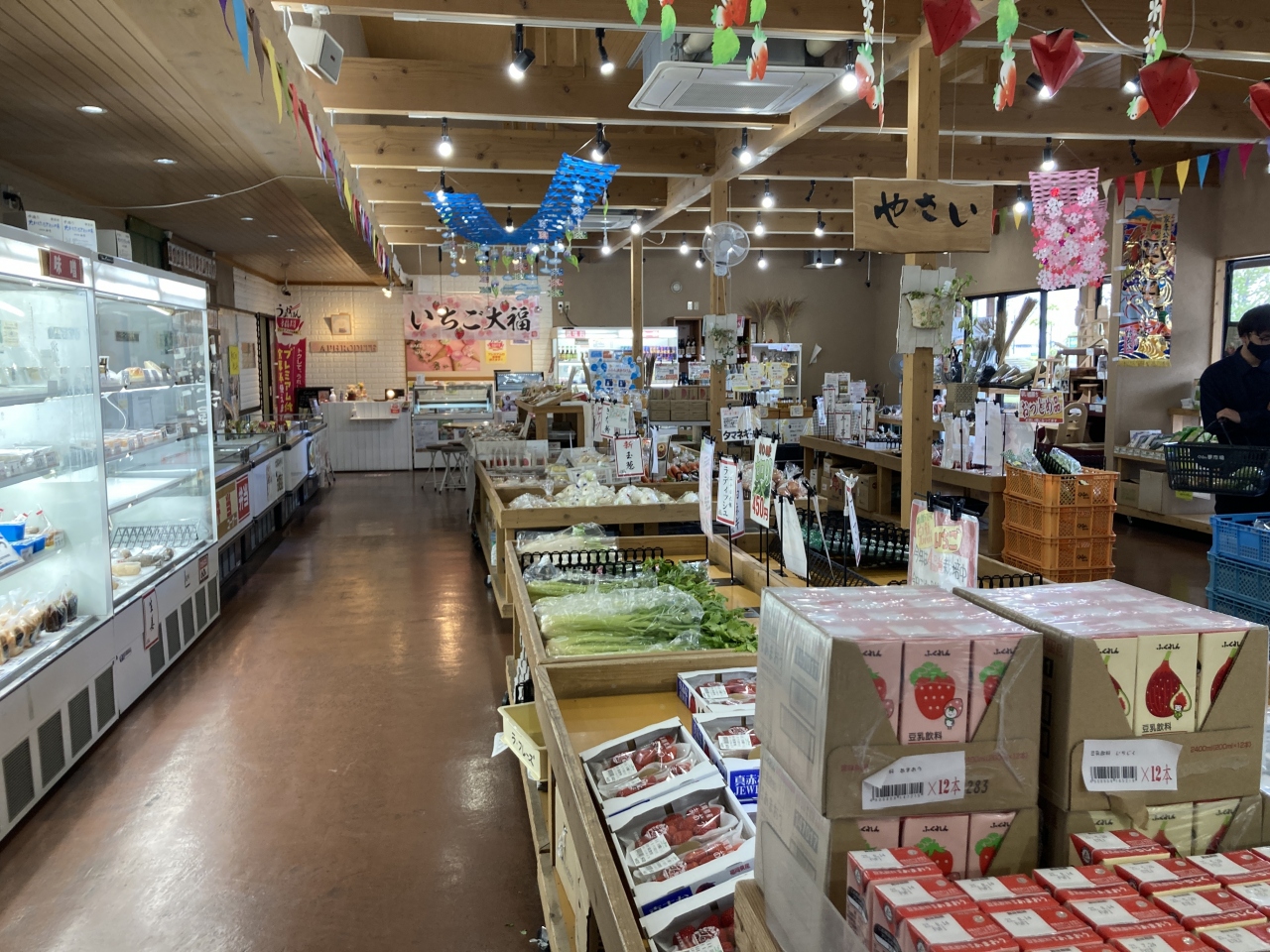 - 地元農産物が主体です。土産になりそうなものは、キノコやあまおうイチゴです。