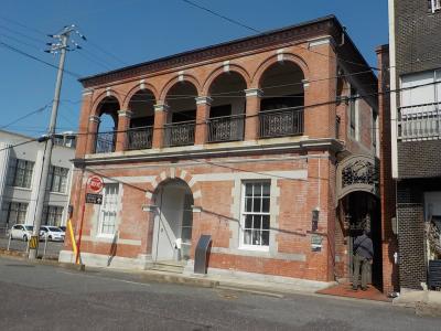 明治時代の後期になると唐戸から北にまっすぐ伸びる通りは外国系商社が並び、下関繁栄の象徴のような存在でした。その一角に旧宮崎商館があります。すぐ西側には現在「田中絹代ぶんか館」として利用されている電話交換局もあります。建物は赤煉瓦造りの2階建てです。各所に花崗岩と思いますが、アクセントとして取り込んでいます。中央にアーチを取り入れた玄関があり、ルネサンス様式の左右対称の建物です。1階の窓は長方形、2階はアーチ形を取り入れたテラスを設けています。