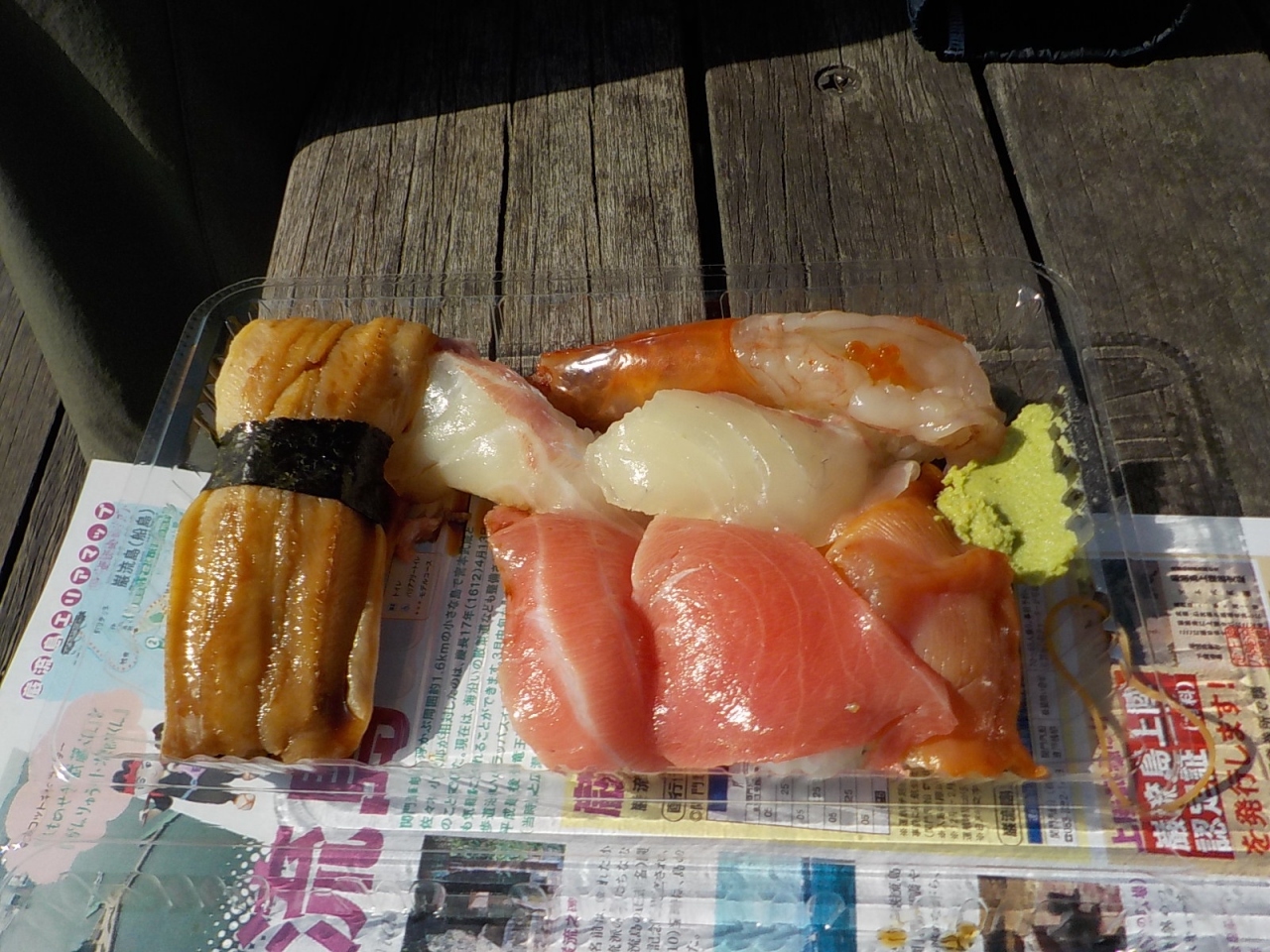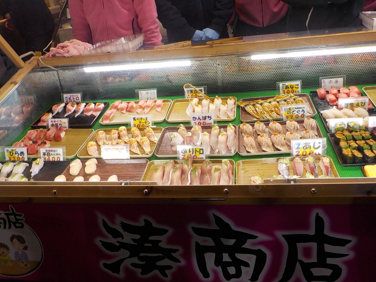 ふぐの袋セリで有名な唐戸市場は、卸売場と小売り売り場が隣り合って設けられています。昼時は絶対に混雑すると考えて、唐戸市場から少し離れた有料駐車場に車を置いて歩いて出かけました。お昼時に見てみると市場前面の国道まで車が行列を作っていました。歴史は1924年に魚市場として出発し、現在は食品の流通販売センターの様態です。小売りしているところは、寿司類が多いです。店員さん注文すると容器に入れてくれます。そして清算です。寒い時でなければ市場を出ると関門海峡沿いにデッキのようなものがあるので、ピクニック気分で買ったお寿司がいただけます。色々なものをいただきましたが、穴子にぎりが身も暑くフワッとした食感のものが1貫に1匹分使っています。300円ほどしますが美味しいです。またこの市場の2階には回転寿司店や魚介の丼がいただけるお店もあり売ます。