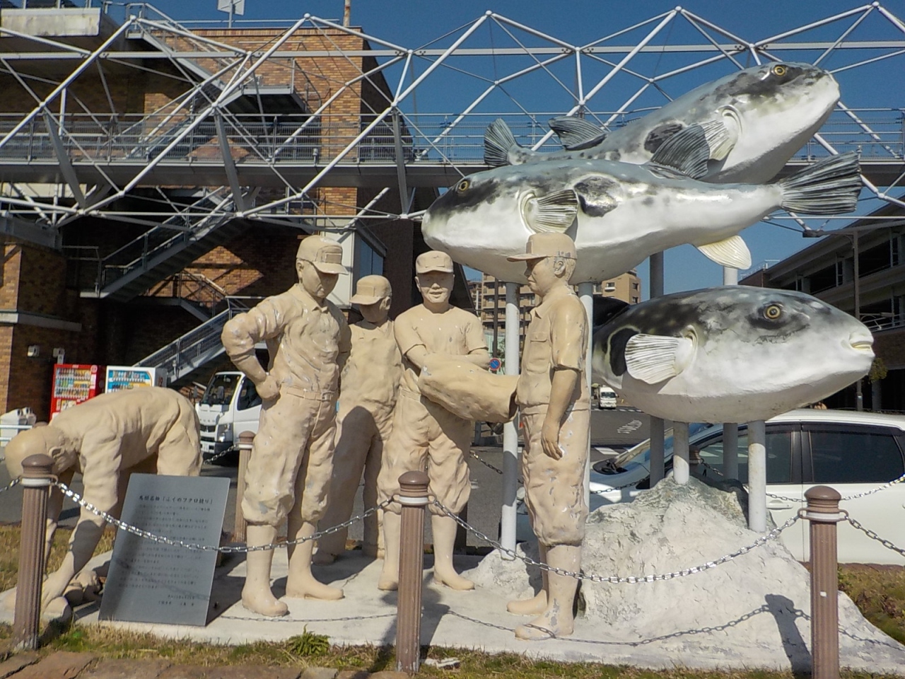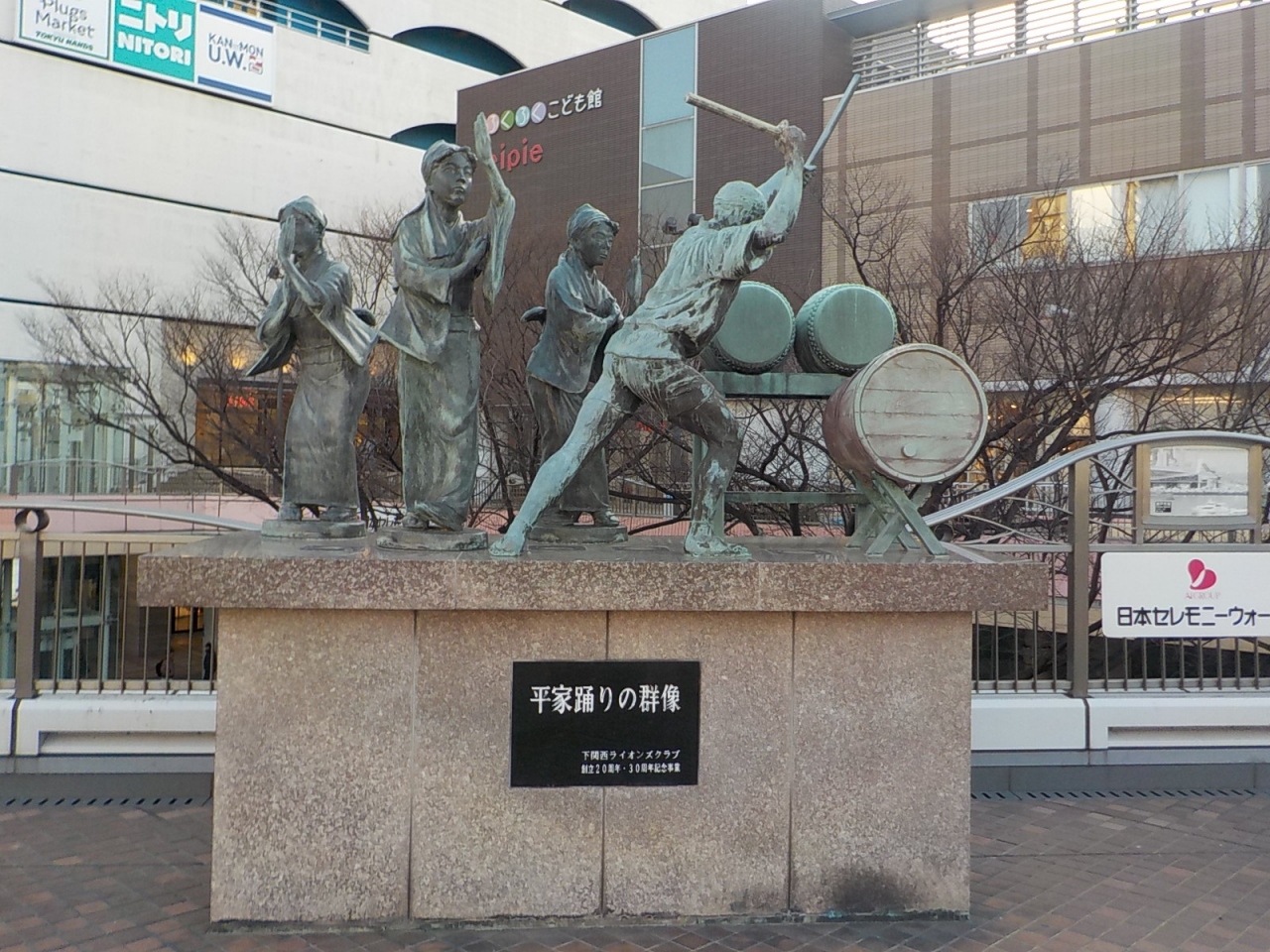 下関で有名な夏祭り(しものせき馬関まつり)で踊られる「平家踊り」をモチーフにした像で、下関駅前の陸橋の上にあります。平家踊りは源平の戦いで敗れた平家が、壇ノ浦の海に沈んだ安徳帝や平家の魂を慰める踊りだそうです。2人の女性踊り子と男女1名ずつが太鼓を打っている像です。