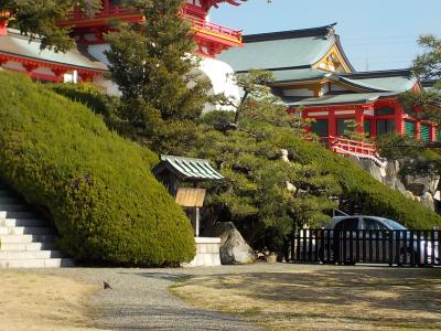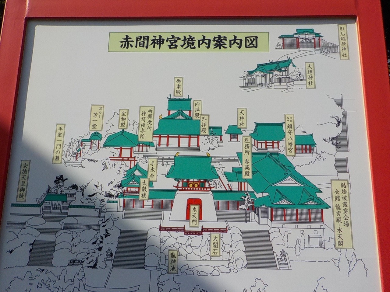 関門橋を渡ってから赤間神宮を目指しました。赤間神宮の前に参拝者用駐車場があるので利用させてもらいました。境内に入って訪問したい場所を案内板でまず確認します。その後、石段を登って水天門をくぐります。この門は安徳天皇が入水された際、二位の尼が「海の中にも都はございます」と詠ったことで造られた門だそうです。このあと拝殿にお参りし、宝物殿、芳一堂、平家一門の墓、安徳天皇御陵を見せていただきました。すぐ隣には春帆楼、日清講和記念館があります。