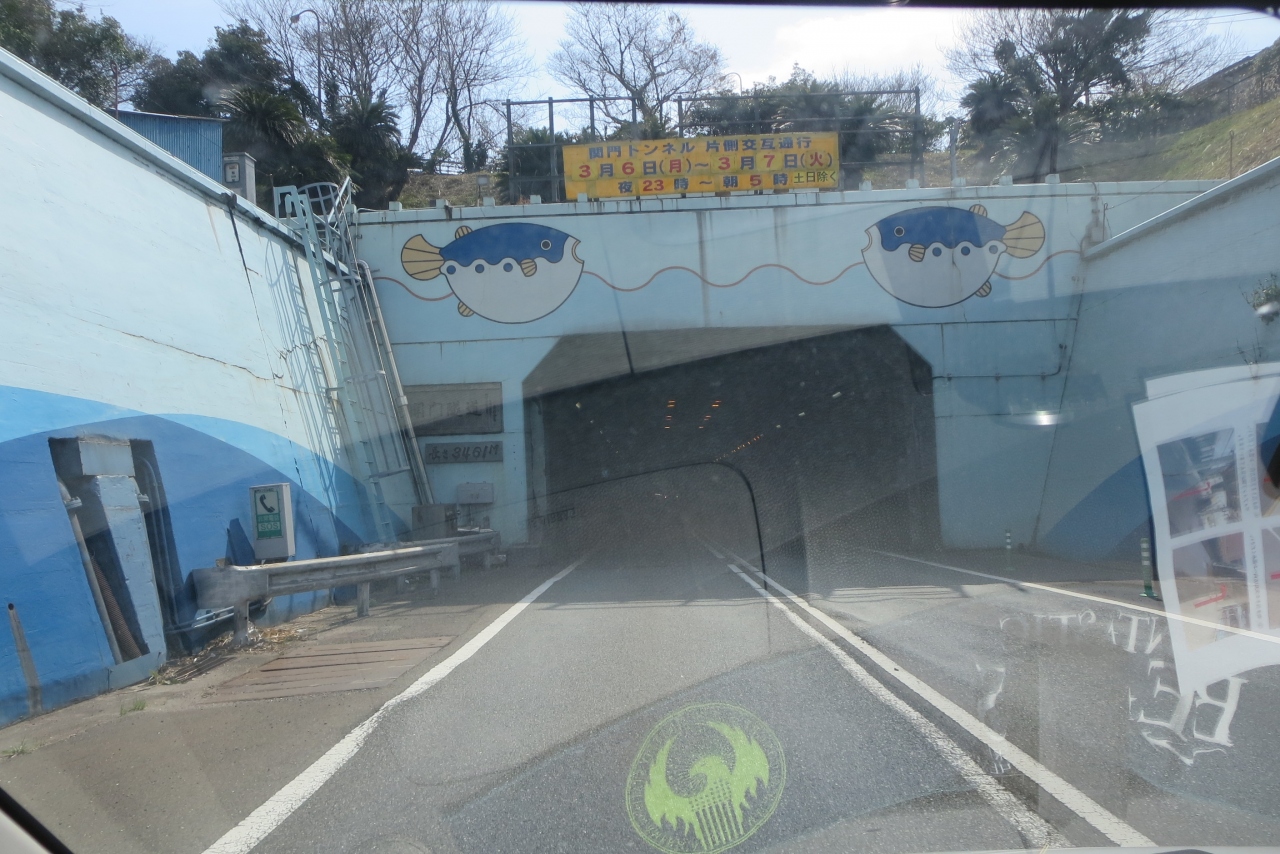 関門海峡トンネルは関門海峡の最も狭い部分にあるトンネルです。新幹線などの鉄道トンネルと区別し関門国道トンネルという場合があります。人道(人は無料)と車道の二階建てになっています。前回利用した人道は海底部分780mの両端に地上とつながるエレベーター(高低差約60m)があります。車道部分はこの部分に加えて地上まで斜路があるのでその分長くなりますので、全長は3500mほどになります。驚いたのは高速道路のようなETC設備がないことで、いまだにトンネルに入る直前で人の手による料金徴収が行われています。今回は下関側から軽自動車を使いましたので通行量は110円でした。入口は下関側にふぐの絵が描かれています。そこから長い坂をダラダラ下りて行き、水平になったと思ったら次は上りになります。この勾配が変わるところが最深部と思います。トンネル内はわずかに見える程度の照明だけですが、ここで火災事故でもあったらとかトンネルが崩れる事故があったらとか余計なことばかり考えていました。