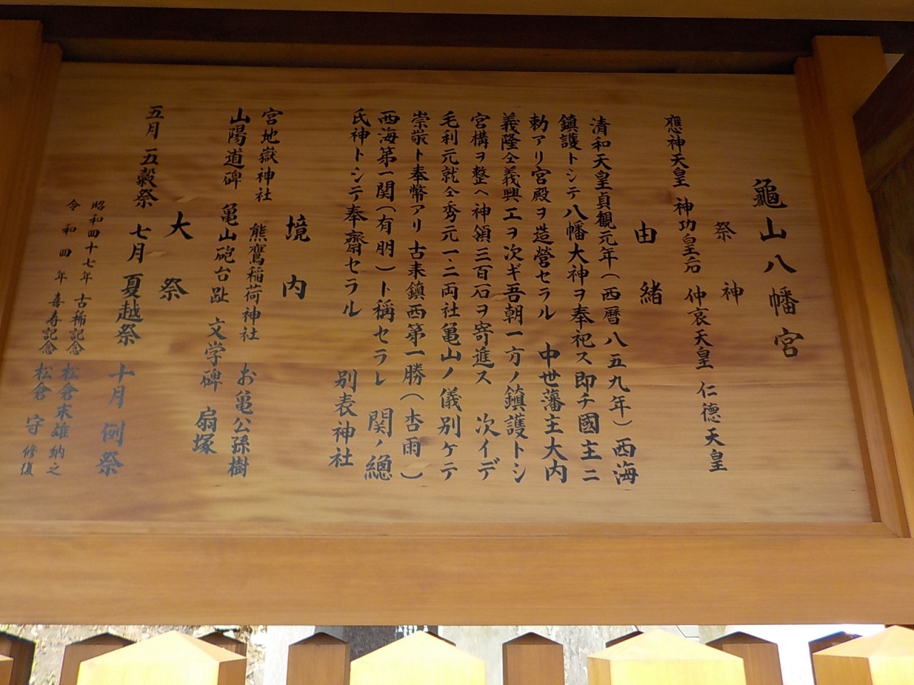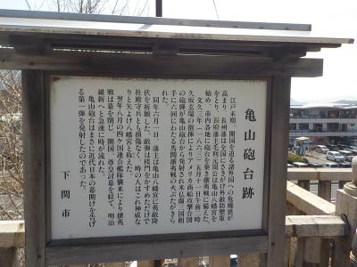 有名な唐戸市場から国道9号を渡ると大きな鳥居があるのですぐに場所は分かります。平安時代初期に創建された神社で歴史があります。ご祭神は応神天皇、神功皇后、仲哀天皇、仁徳天皇です。先ず鳥居ですが御影石でできた鳥居では二品一の大きさです。石段を上って拝殿前まで進み参拝してから、後ろを見ると唐戸市場や関門海峡が一望できます。高台にあるのでなかなか景色もよいです。見どころは400年前に豊臣秀吉が亀山八幡宮を参拝し、その記念に植えた太閤蘇鉄があります。日本一のふくの像も有名です。