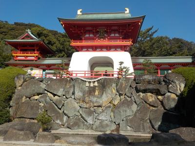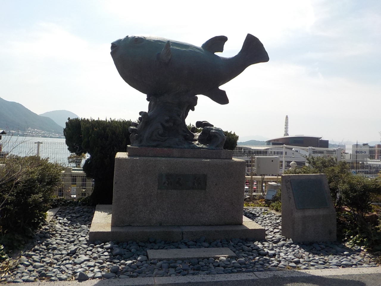 - 拝殿前からの関門海峡の景色がよいですし、大鳥居や二日本一大きなふぐの像などもあります。